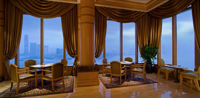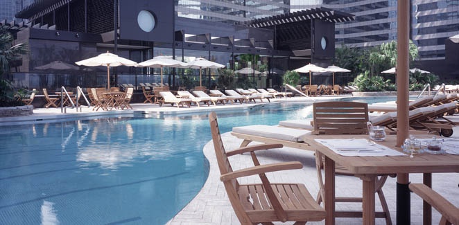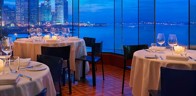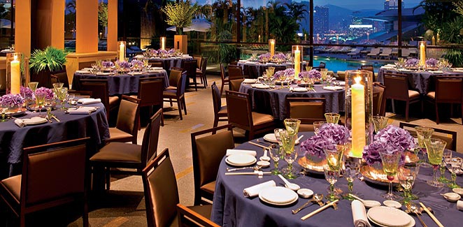 Ресторан Grand Café, оформленный в стиле Ар Деко, удивляет посетителей панорамными видами на гавань и город и предлагает блюда международной кухни. Дресс-код — Smart Casual.— У бассейна расположен ресторан The Grill. Дресс-код — Casual.