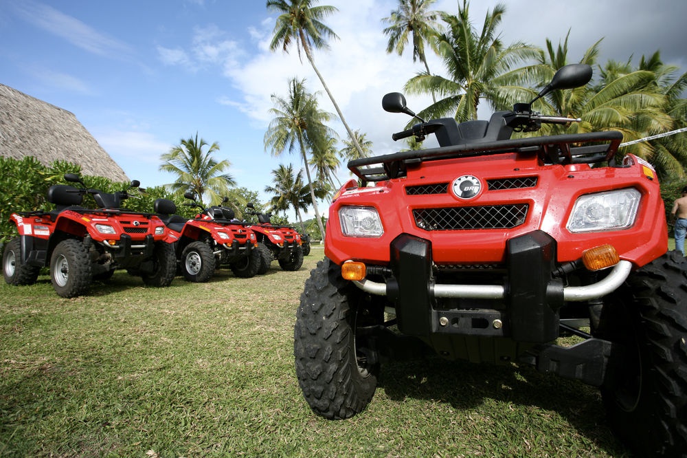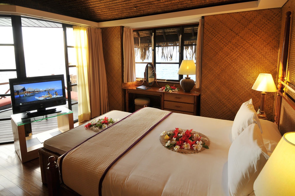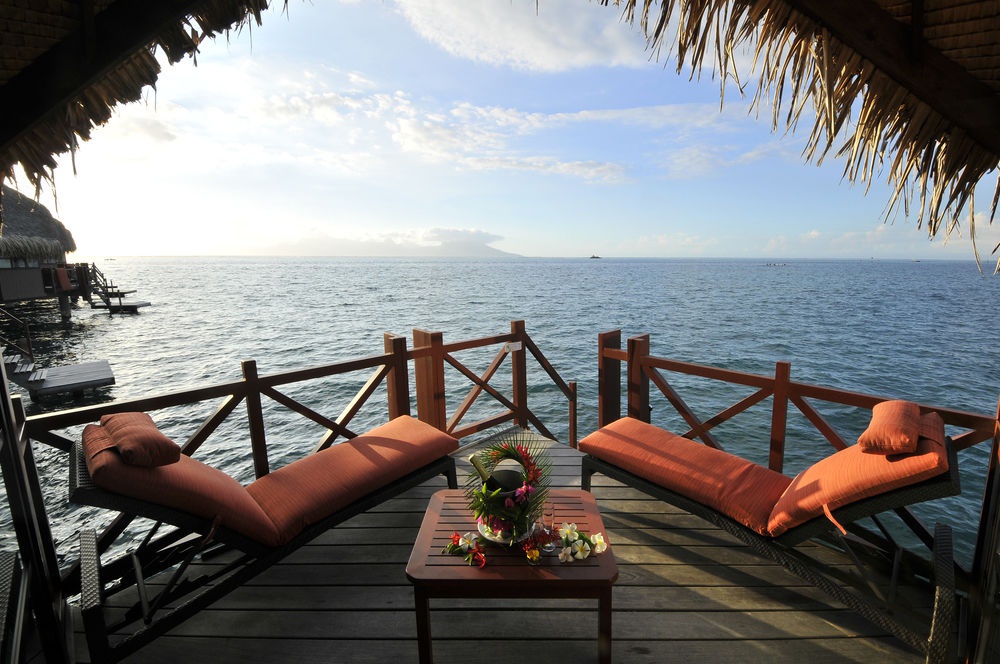 Overwater Motu Bungalow — расположены на сваях в воде на отдельном островке с видом на остров Муреа, оформлены в полинезийском стиле, состоят из спальни с гостиной зоной, ванной комнаты, террасы с зоной отдыха и с прямым спуском в воду.
