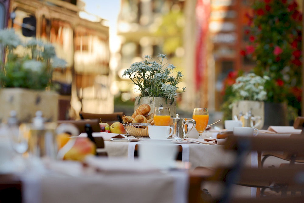 В хорошую погоду столики сервируют на солнечной террасе.
