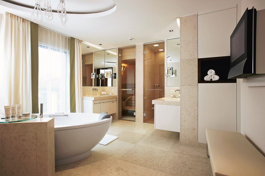 Palais Suite: 73-77 м2. Расположен в историческом дворце Palais. Номер выполнен в элегантном современном стиле и выдержан в теплых желто-коричневых тонах, состоит из спальни, гостиной, ванной комнаты, отделанной бело-коричневым мрамором, вид на сад.