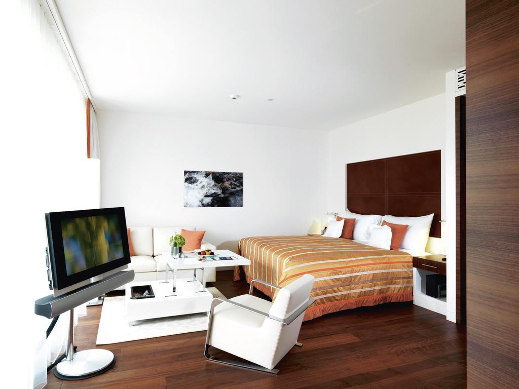 Comfort Room: 35 м2. Номер выполнен в элегантном современном стиле и выдержан в теплых желто-коричневых тонах, в некоторых номерах – эксклюзивные паркетные полы. Состоит из спальни, ванной комнаты, отделанной бело-коричневым мрамором. Часть номеров имеют балконы с видом на парк или сад.