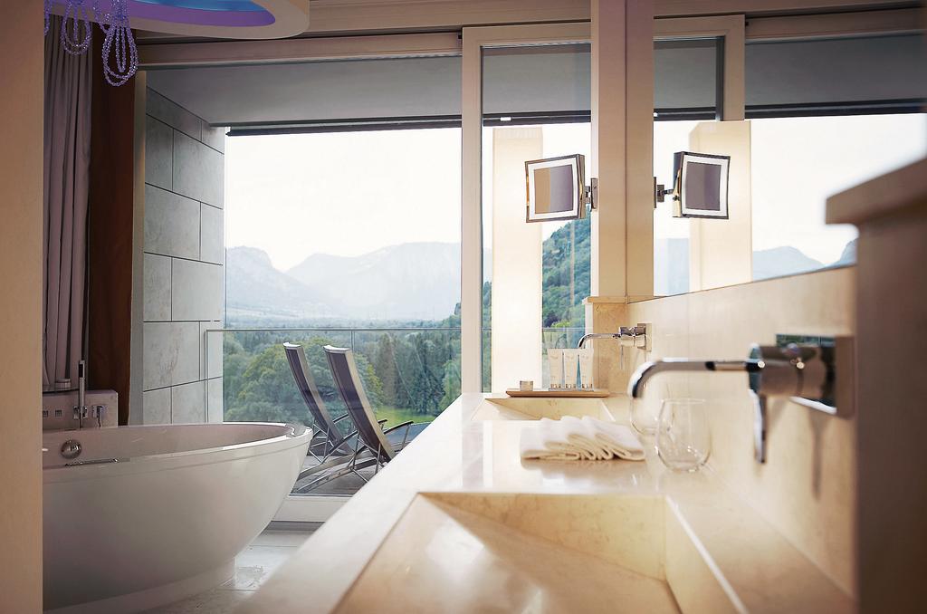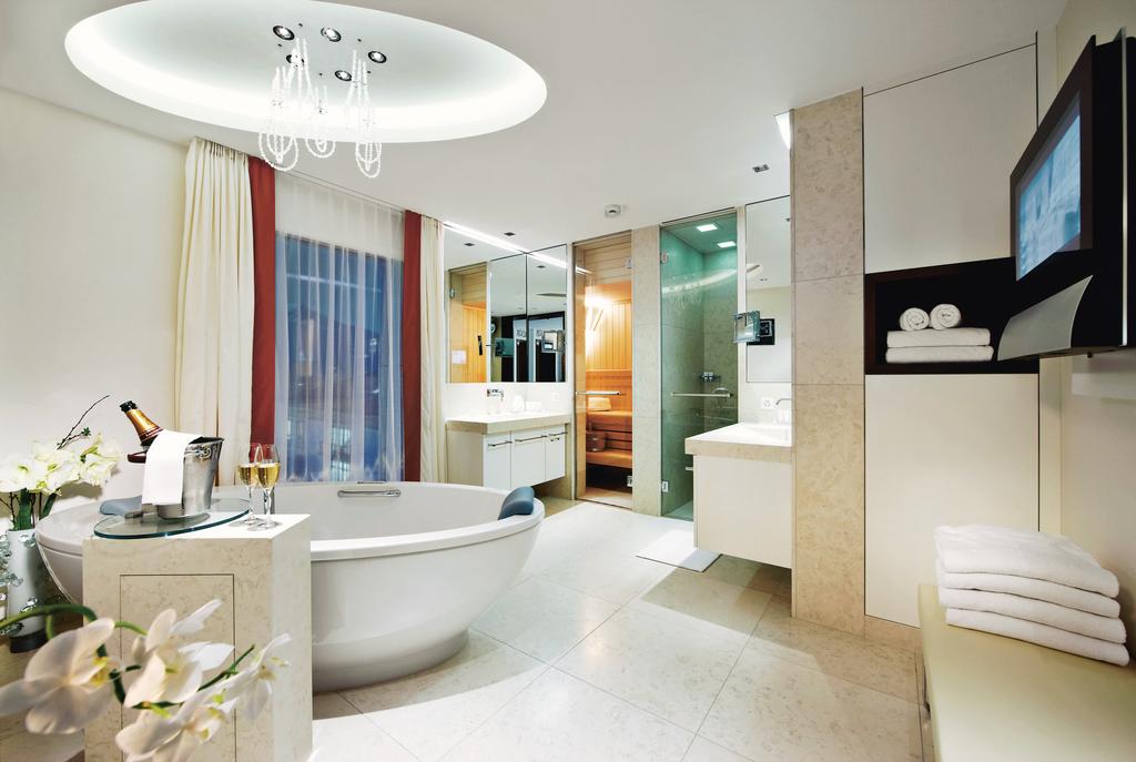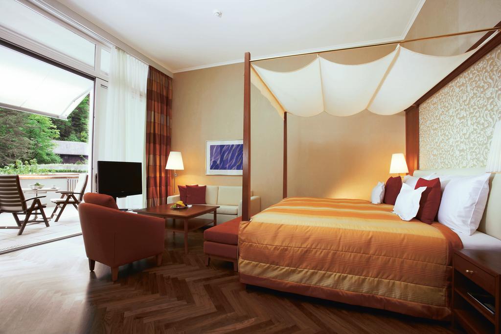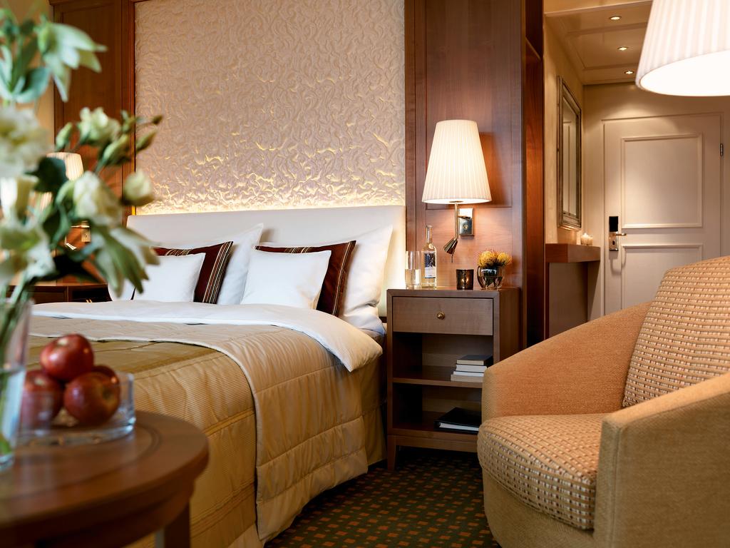 Imperial Suite: 105 м2. Роскошный исторический номер, расположенный в историческом дворце Palais, украшенный старинной лепниной, инкрустированными паркетными полами и изысканными произведениями искусства, обставлен мебелью в стиле барокко. Включает спальню с кроватью под балдахином и зоной отдыха, просторную гостиную с обеденной зоной, большую ванную комнату с отдельно стоящей ванной, выходит на парк и горы. Возможно соединение с другим номером.