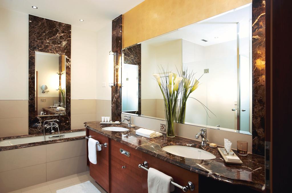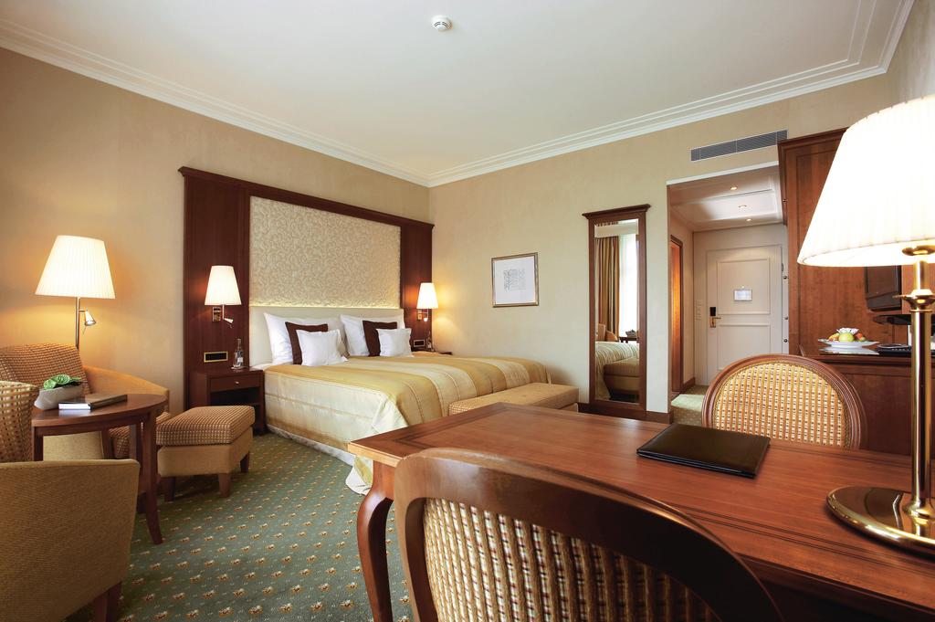 Deluxe Room: 45 м2. Номер выполнен в элегантном современном стиле и выдержан в теплых желто-коричневых тонах, в некоторых номерах – эксклюзивные паркетные полы. Состоит из спальни, ванной комнаты, отделанной бело-коричневым мрамором. Часть номеров имеют балконы с видом на парк или сад.