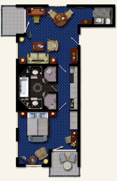 Royal Suite: 200 м2. Роскошный номер, состоит из фойе, гостиной с пианино, камином обеденной зоны, 2 спален с кроватями king-size, просторной ванной комнаты, отделанной гранитом, с джакузи и термальной водой, гостевой туалетной комнаты, большого балкона с видом на горы и гольф-поле. Пол гостиной отделан инкрустированным паркетом. Возможно соединение с Junior Suite. Гостям номера предлагаются услуги дворецкого (по запросу).