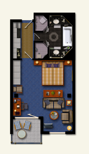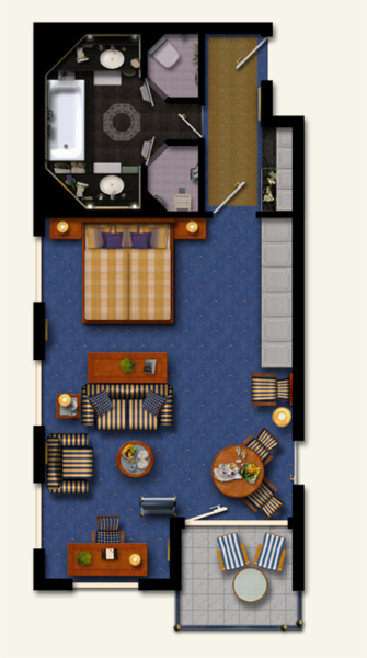 Corner Junior Suite: 60 м2. Угловой номер, выполнен в теплых желто-голубых тонах, состоит из спальни с кроватью, украшенной стойками, гостиной зоны с обеденным столом, ванной комнаты, балкона с видом на горы или парк отеля. Возможно соединение с Junior Suite.
