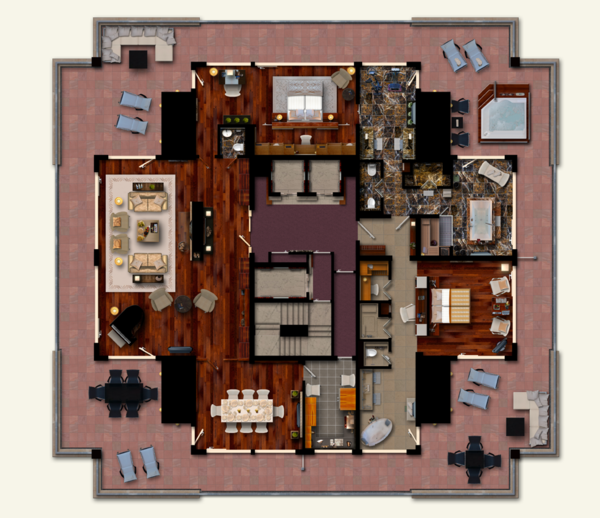 Penthouse Floor: 550 м2. Представляет собой соединение Penthouse Suite и Spa Suite Superior, которые занимают весь 9 этаж и образуют 2 bedroom suite.