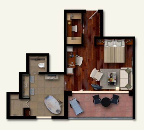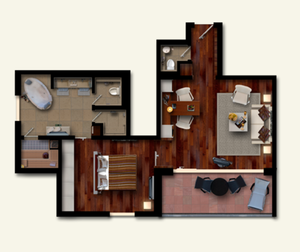 Spa Suite: 87 м2. Новый шикарный номер открытого плана, выполненный в современном дизайнерском стиле, с полами из орехового дерева и кожаной мебелью, расположен на 7 и 8 этажах. Включает спальню с большой кроватью, снабженной эргономичным матрасом Airlux, гостиную с аппаратурой B&O, гардеробную, просторную ванную комнату, украшенную светильниками Swarovski, - с джакузи, сауной, паровой кабиной, термальной водой и окнами, гостевую туалетную комнату, большой балкон с камином и видом на горы, или парк отеля. Cпальня и ванная комната отделены стеклянной дверью. Возможно соединение с соседним номером Spa Suite. Гостям номера предлагаются услуги дворецкого (по запросу).