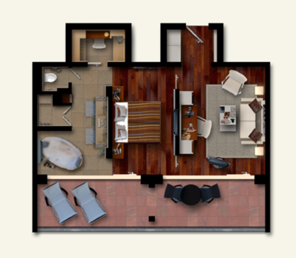 Suite: 80 м2. Выполнен в разных цветовых гаммах, состоит из спальни гостиной, столовой, просторной ванной комнаты, выходит на горы или парк отеля. Возможно соединение с Junior Suite или Suite и присоединение дополнительных спален.