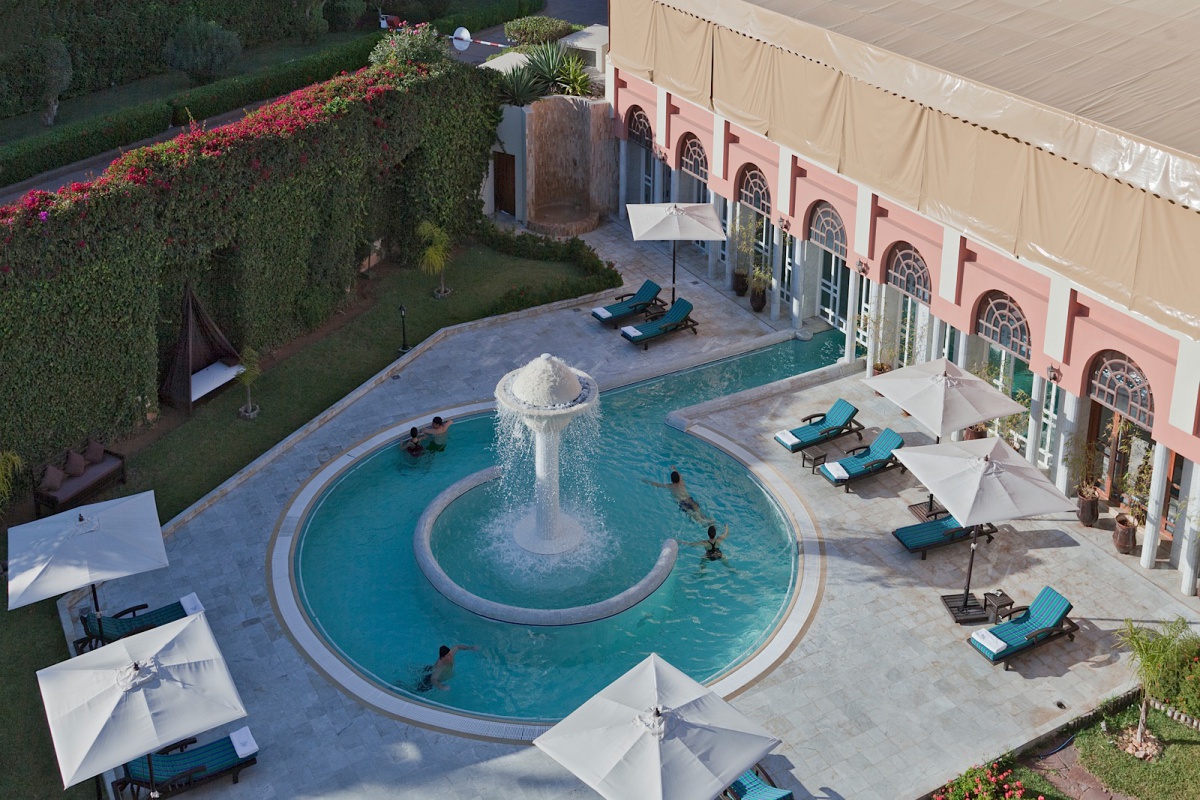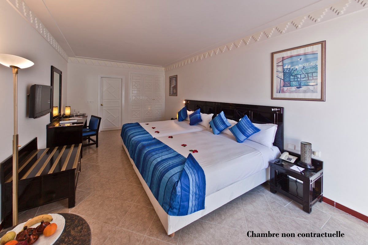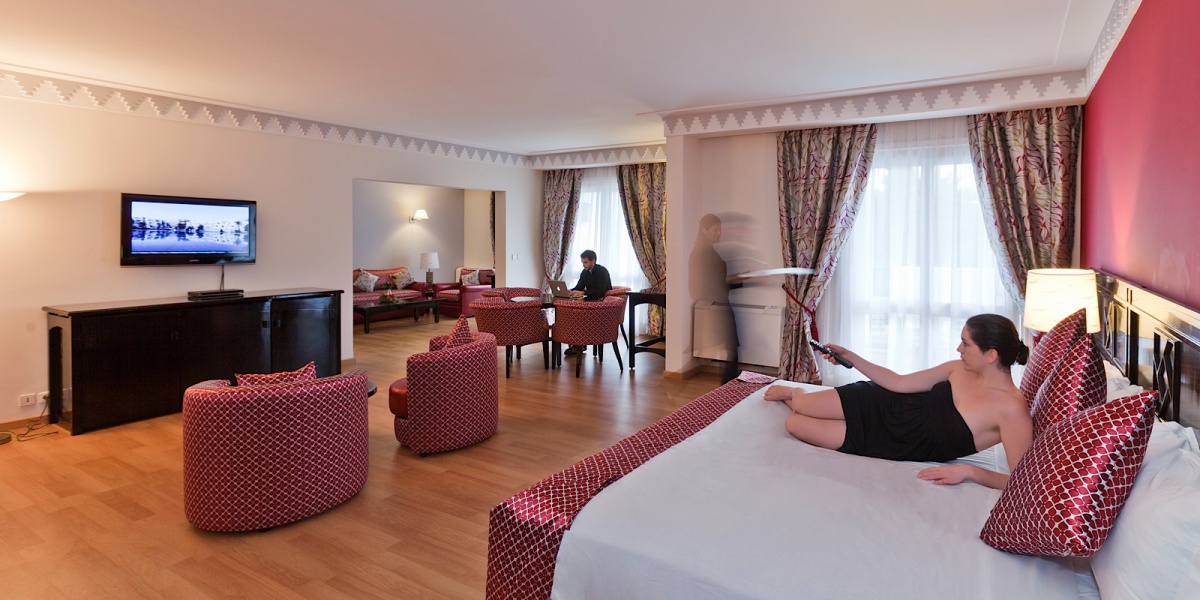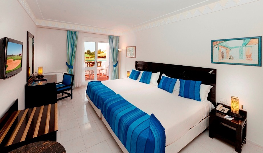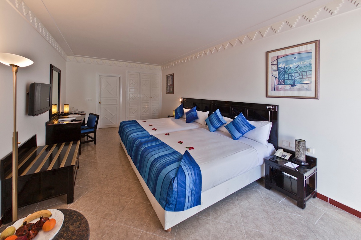 Все номера включают балкон или террасу, с которых открывается вид на бассейн или сад. Внутреннее убранство словно дополняет чарующую атмосферу парка с тишиной изогнутых аллей, изумрудной зеленью деревьев и лазурной лагуной бассейна, отражающего красочное здание отеля и улавливающего частицы окружающего пейзажа. В интерьерах номеров прослеживается та же игра с восточными мотивами и марокканским стилем, отражающаяся как в восточных орнаментов ковров, пышных портьерах и покрывалах, так и в грациозных изгибах удобной мебели, неизменной яркости эстампов и панно.