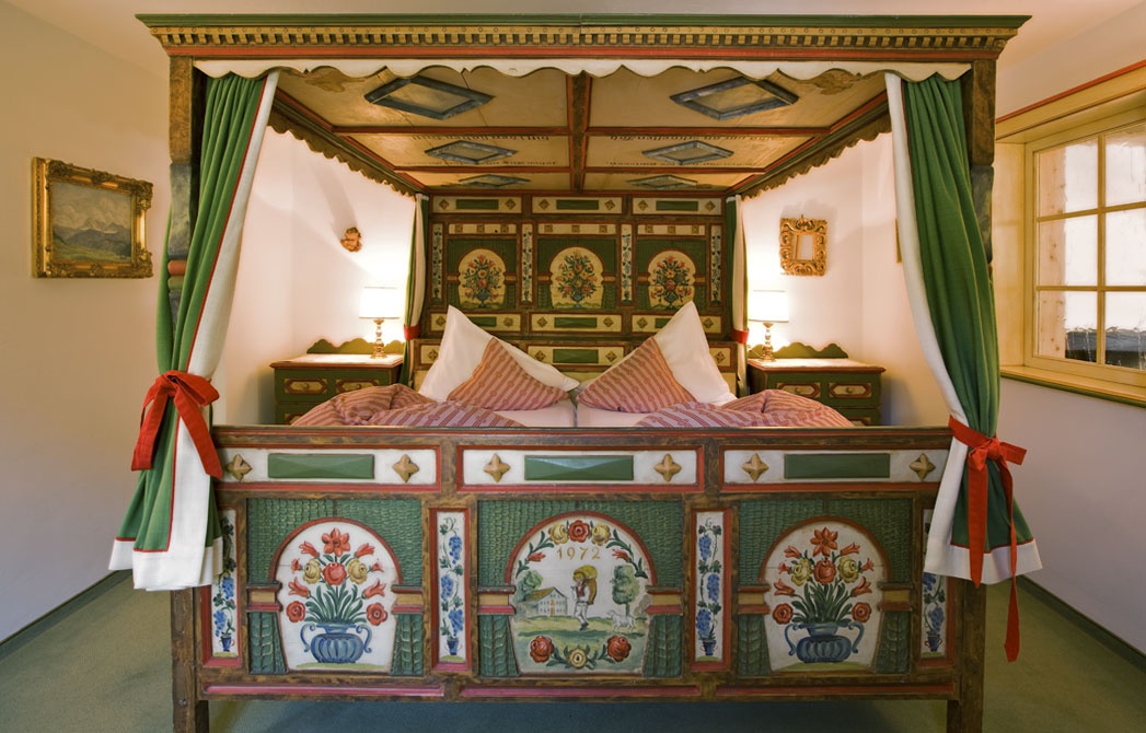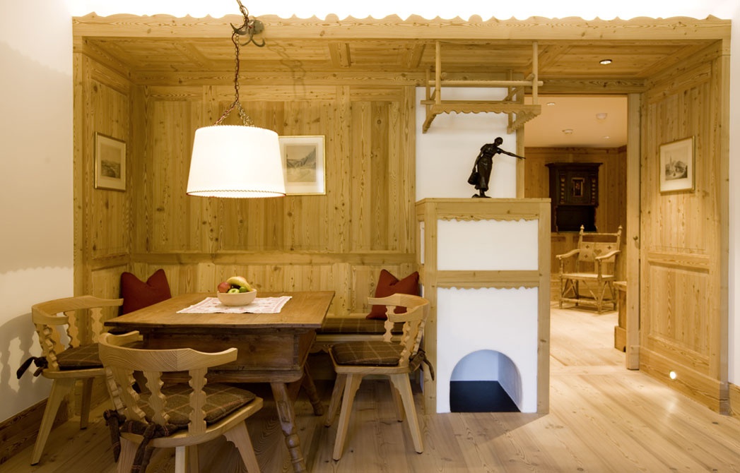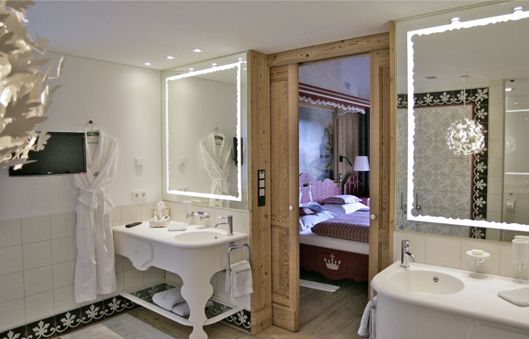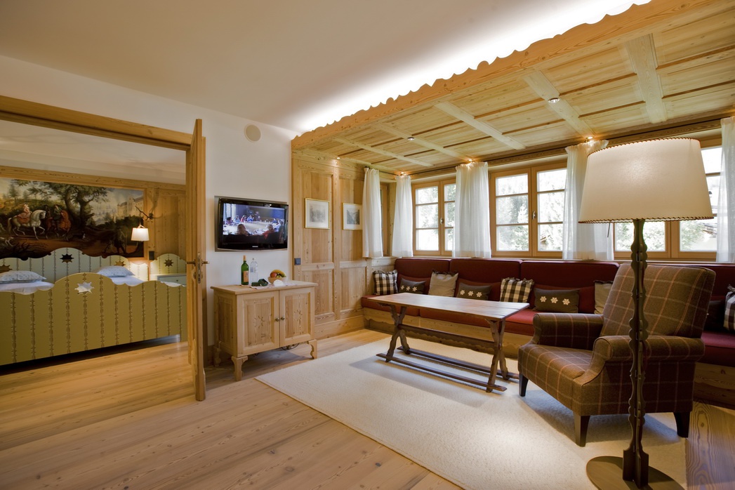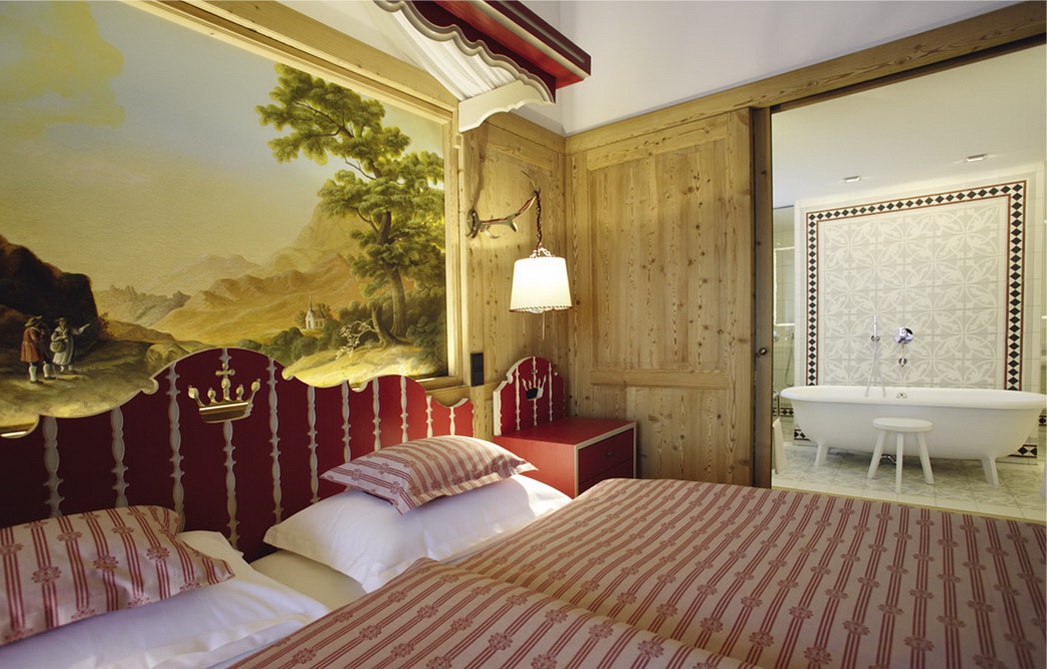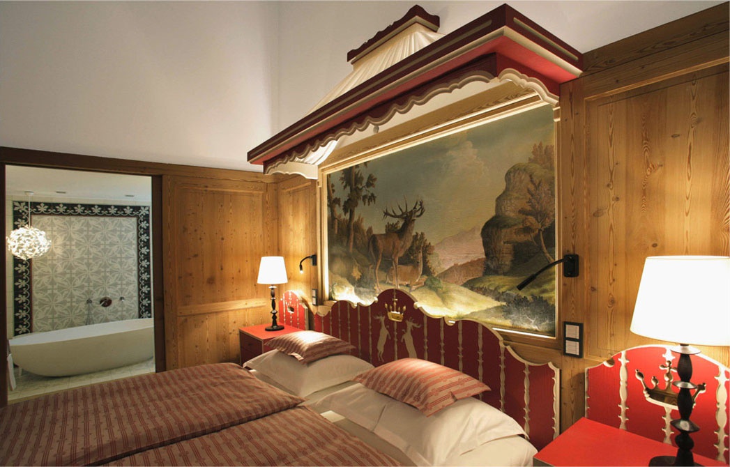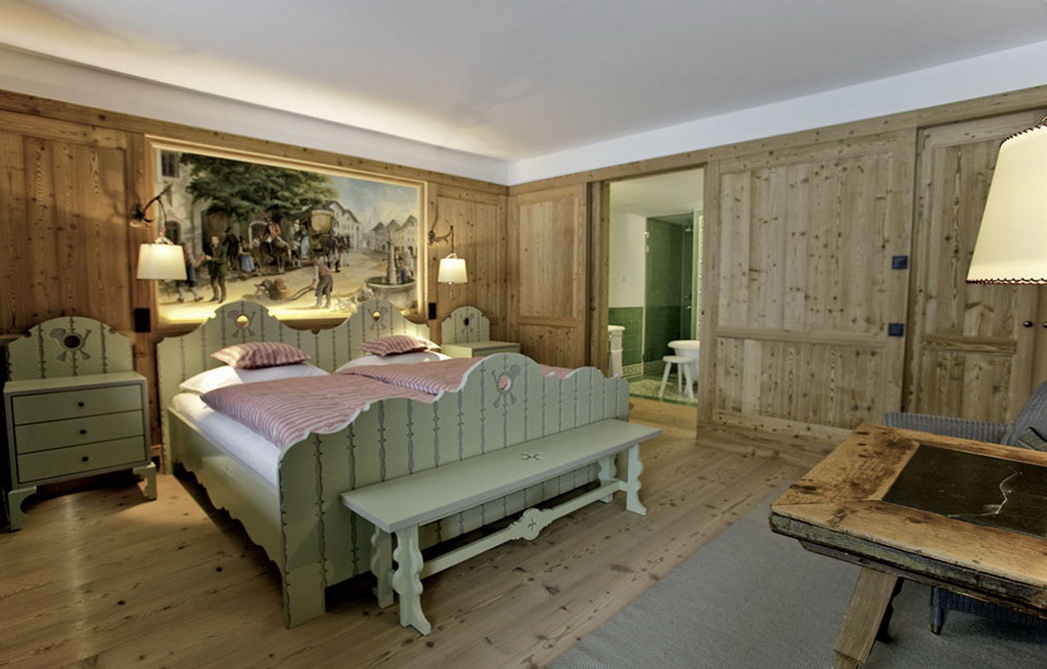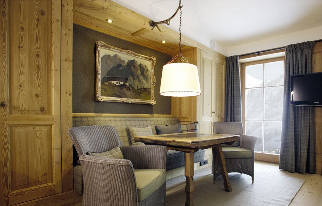 Все интерьеры выполнены в традициях старинного альпийского охотничьего домика с деревянными потолками и стенами, старинными картинами и украшениями из оленьих рогов. В номерах установлены старинные печи, обложенные уникальной плиткой. Все интерьеры номеров уникальны и пропитаны традициями Альп, дополнены старинной мебелью и роскошными гобеленами. В ванных комнатах потрясающая отделка из голландской плитки с этническими орнаментами, изготовленная на заказ отеля.