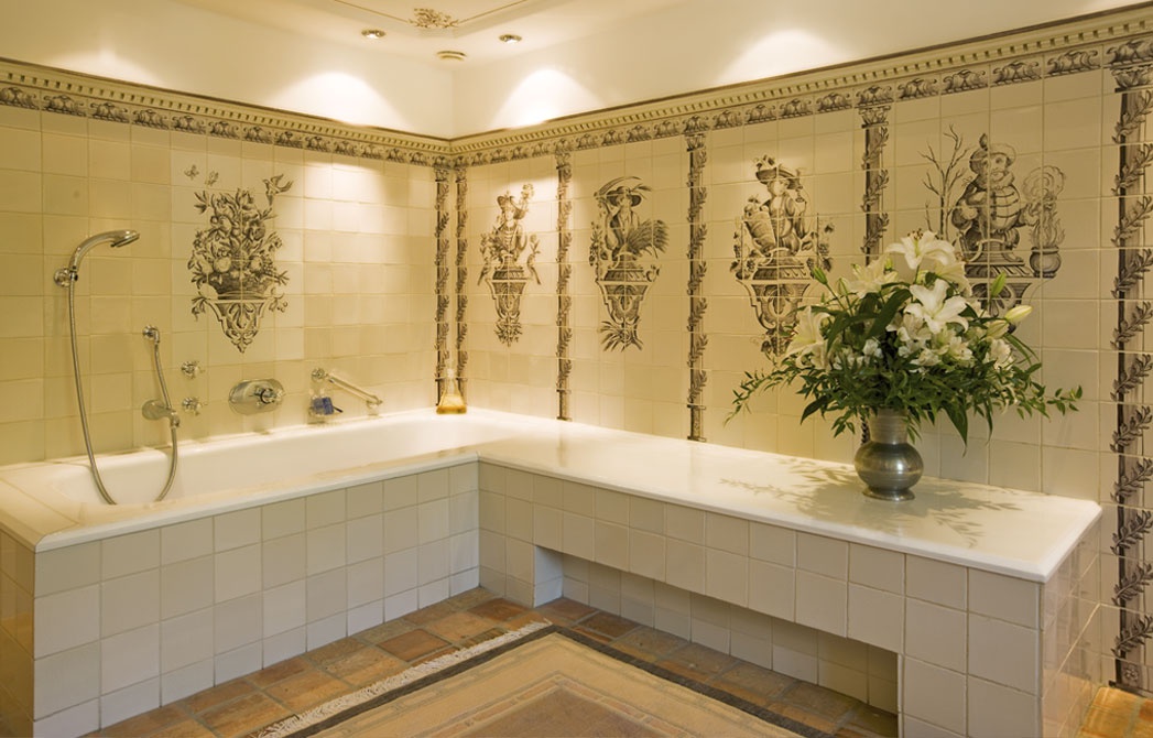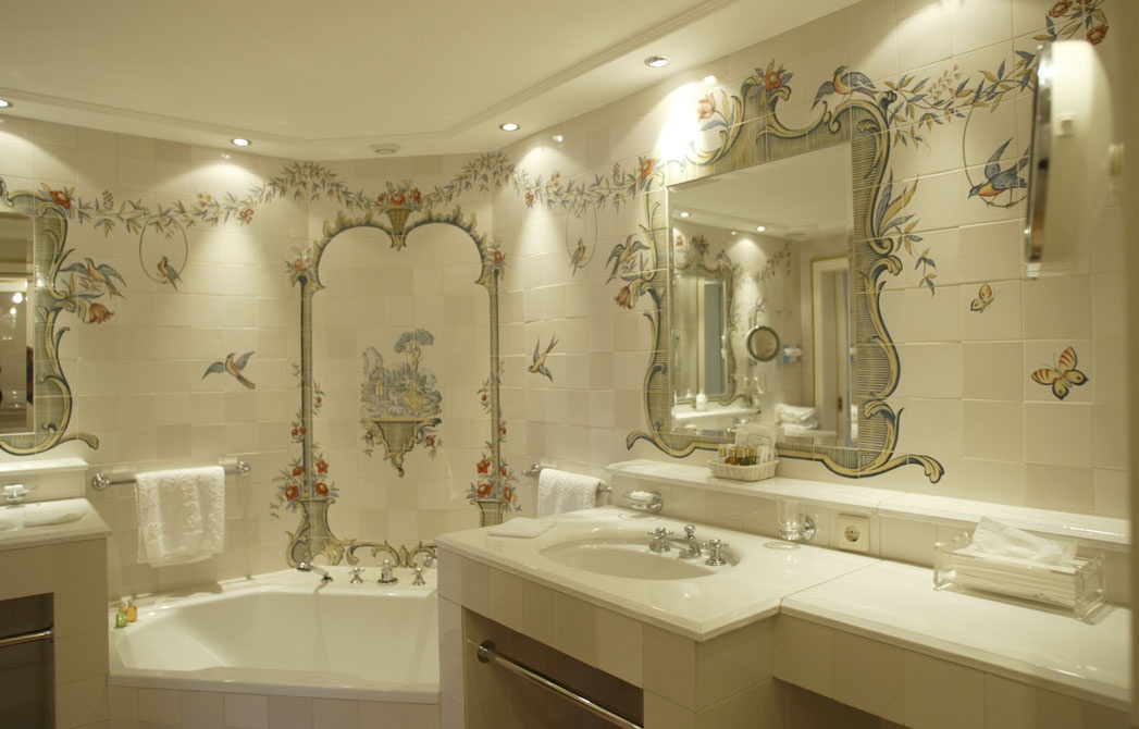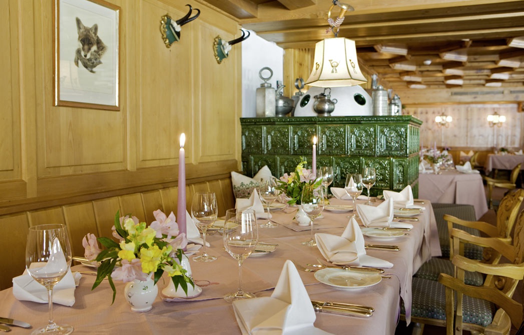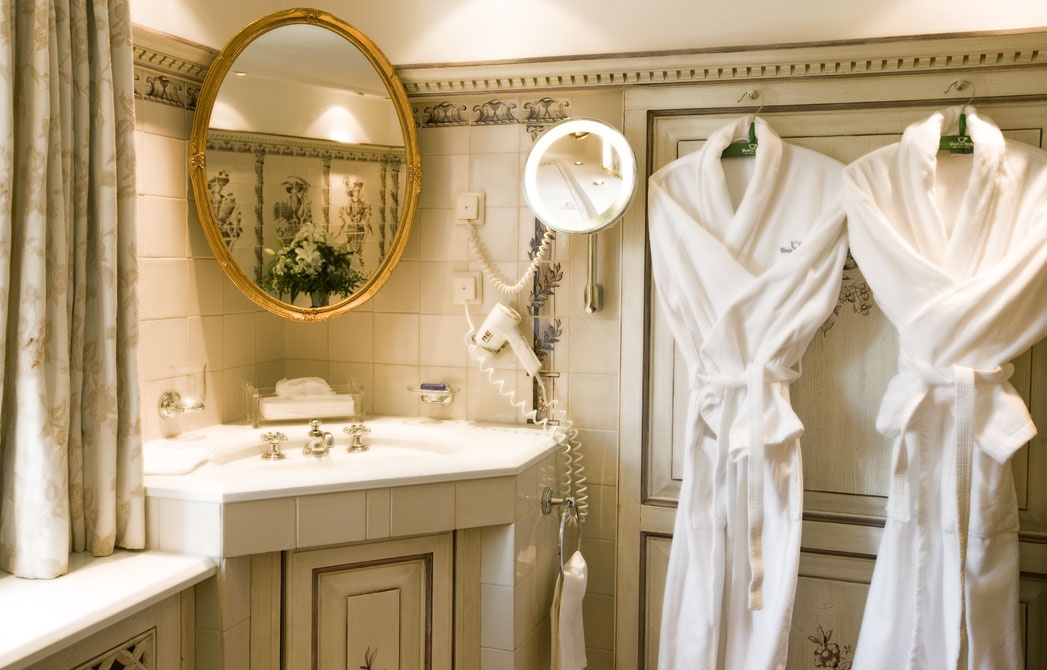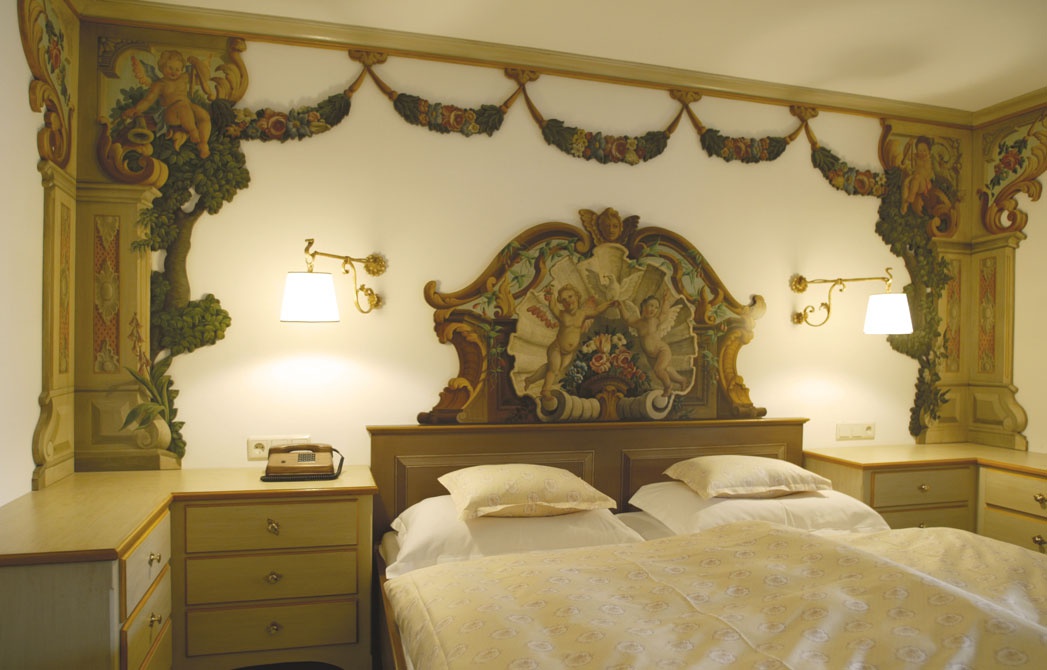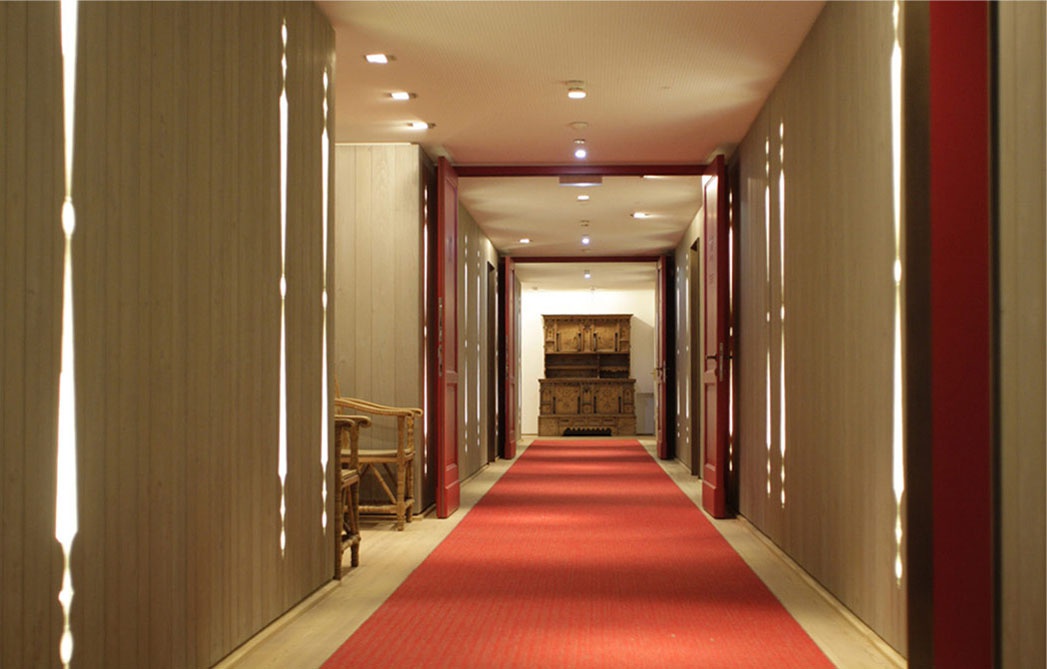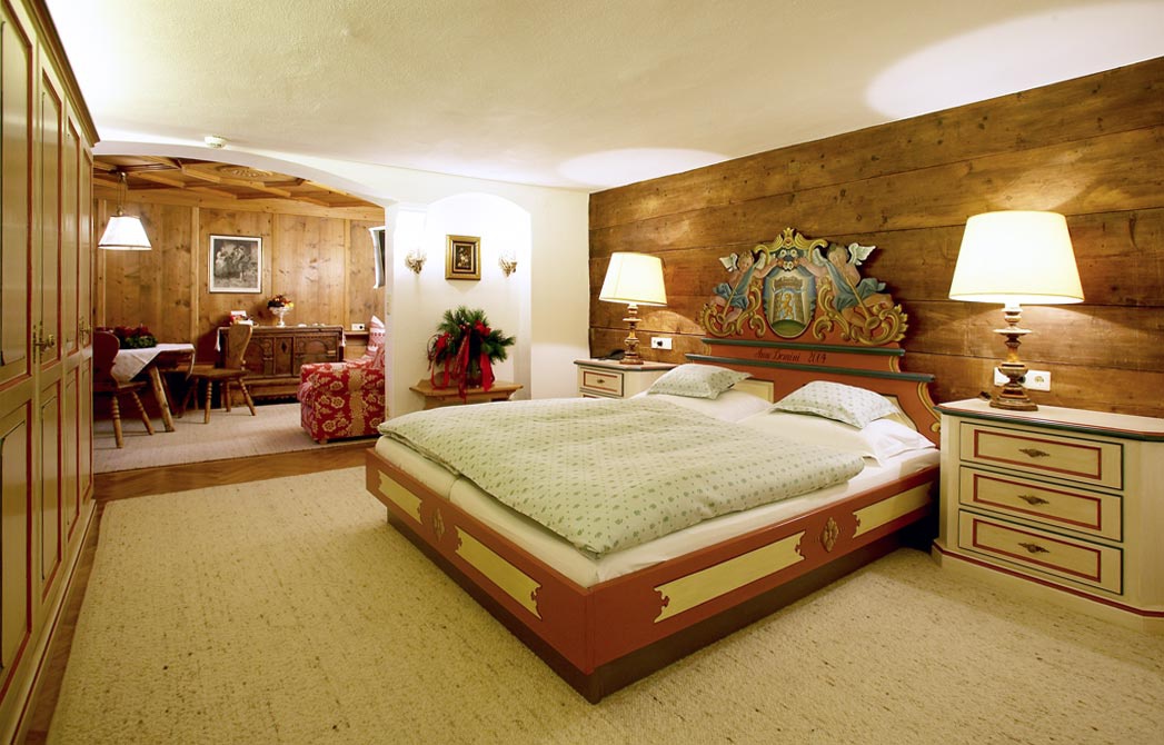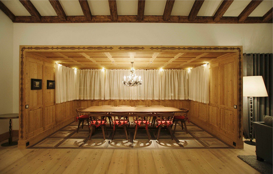 Все интерьеры выполнены в традициях старинного альпийского охотничьего домика с деревянными потолками и стенами, старинными картинами и украшениями из оленьих рогов. В номерах установлены старинные печи, обложенные уникальной плиткой. Все интерьеры номеров уникальны и пропитаны традициями Альп, дополнены старинной мебелью и роскошными гобеленами. В ванных комнатах потрясающая отделка из голландской плитки с этническими орнаментами, изготовленная на заказ отеля.