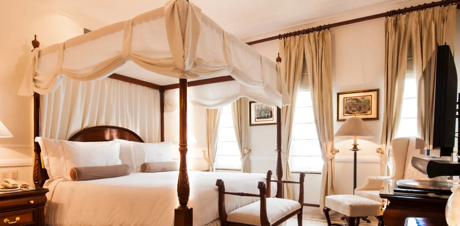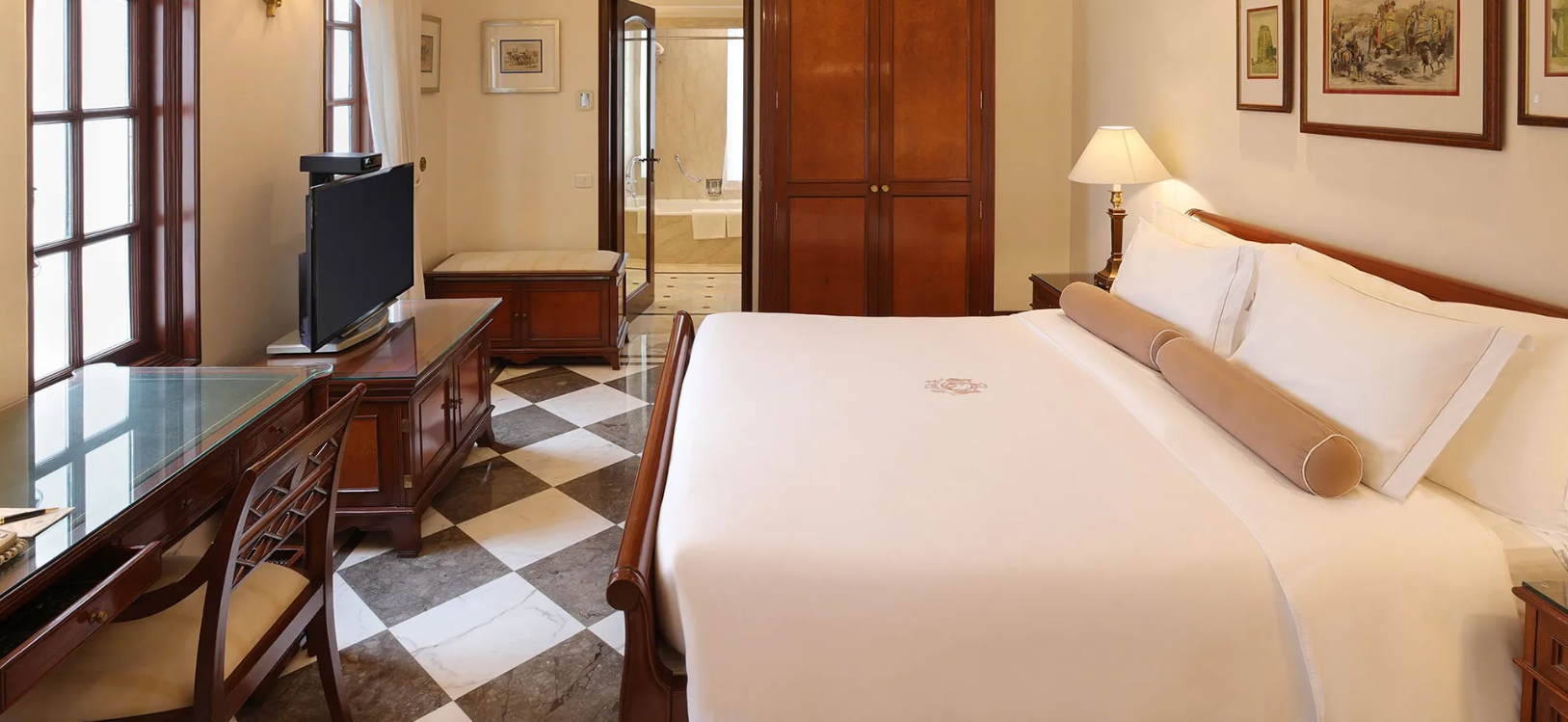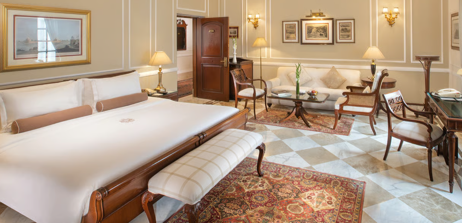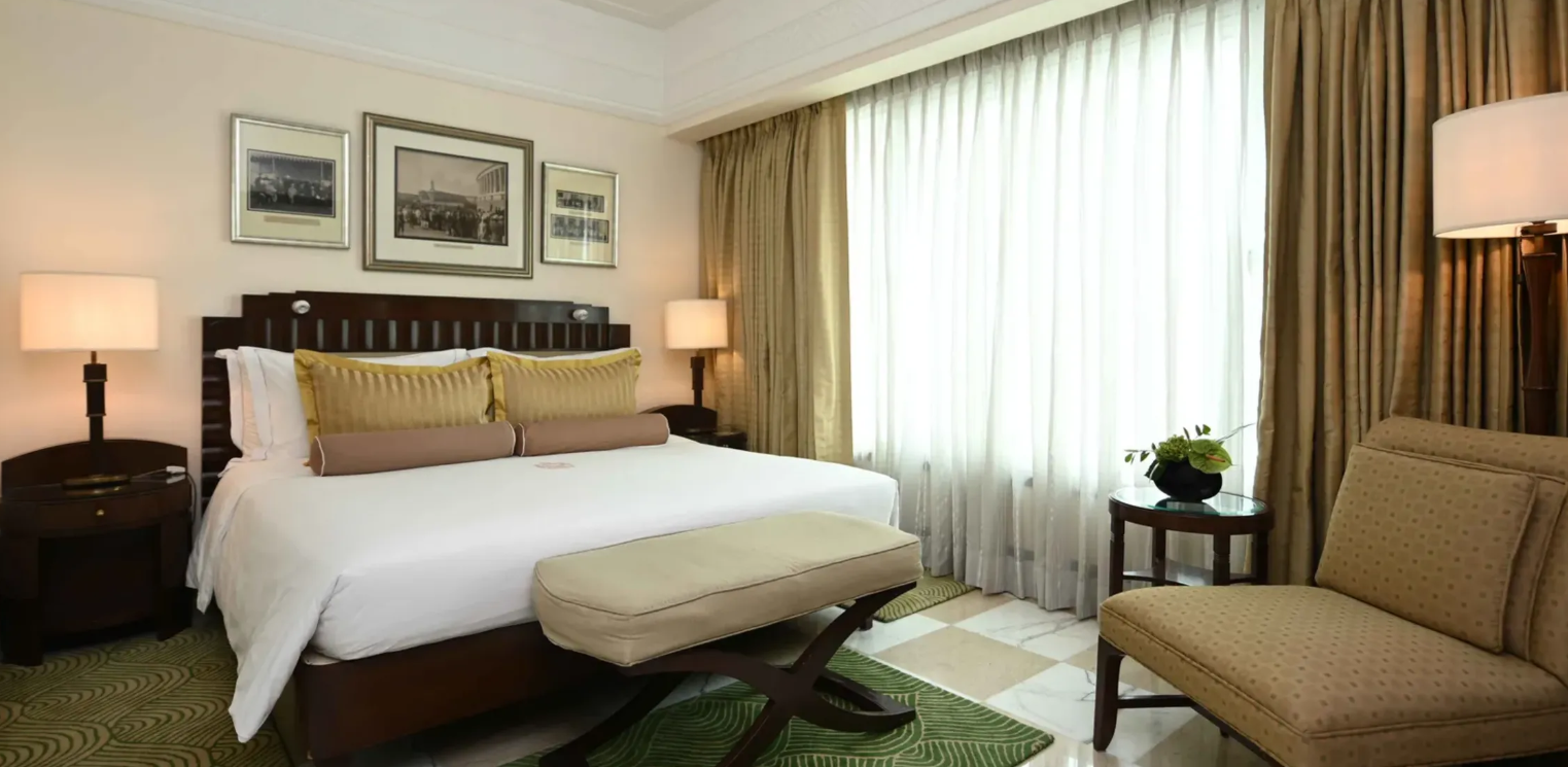 Категории включают Deco Room, Imperial Room, Heritage Room, Grand Heritage Room, а также сьюты: Heritage Suite, Deco Suite, Viceroy Suite, Luxury Suite и The Imperial Suite. Интерьеры выполнены в классическом стиле с элементами ар-деко, антикварной мебелью, мраморными ванными комнатами и высокими потолками.