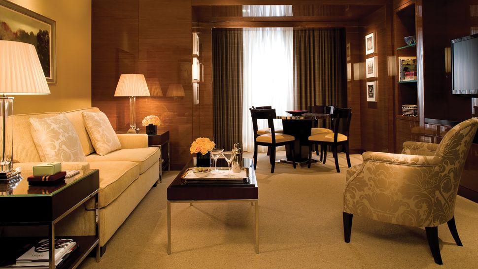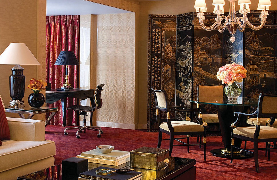 Deluxe One-Bedroom Suite: 112 м2 . Расположен с 6 по 8 этаже, выходит на город, состоит из гостиной с камином и обеденной зоной на 6 персон, спальни с кроватью king-size, гардеробной, ванной комнаты с ванной и подогреваемыми полами, гостевой туалетной комнаты. Максимальное размещение - 3 взрослых или 2 взрослых+1 ребенок. Возможно присоединение дополнительной спальни.