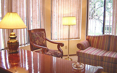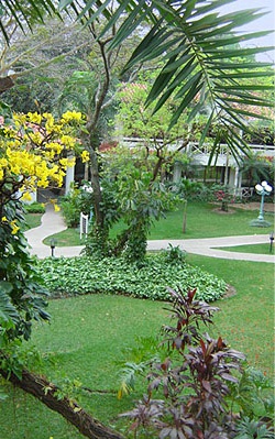 Небольшое алебастровое здание с терракотовой черепичной крышей, уютными верандами, огромным колониальным патио окружено подлинным тропическим раем, где у голубой лагуны бассейна слышно неспешное бормотание фантастических водопадов, щебетание экзотических птиц и нежное колыхание грациозных пальм по мановению набегающего ветерка. Гости Los Tajibos получат особенное наслаждение не только от лицезрения прекрасных видов на роскошные сады, водопады, патио или бассейн, открывающихся с балконов всех номеров, но и от гармонирующего с ними внутреннего убранства. Филигранные колонны, вычурная роспись, тончайшие ткани, эффектная мебель и ощущение особой легкости, достигнутое благодаря искусственному расширению пространства за счет игры света — придают особый шарм облику гостиницы.