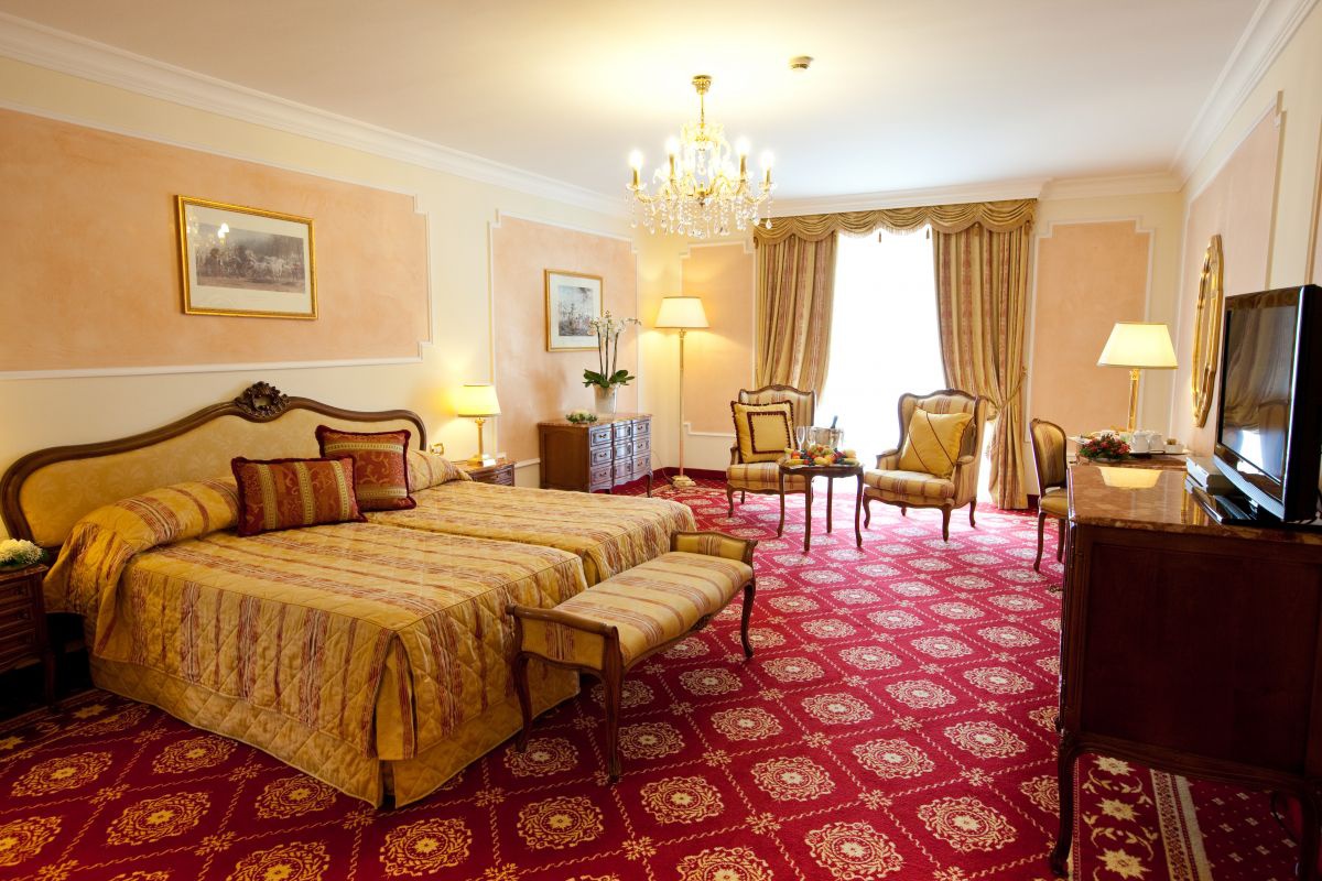 Изысканные двухкомнатные сьюты общей площадью 90 кв м, интерьер в стиле Людовика XVI, просторные ванные комнаты, облицованные итальянским мрамором, с ванной и душевой кабиной. Небольшая отдельная гардеробная; гостиная с паркетным полом и декоративным камином; спальня, отделенная от гостиной дверью.