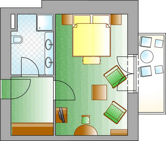 Double room Gastein, CAT C,D: 28-35 м2, окна на юг. В номере спальня c двуспальной или отдельными кроватями, гостиная зона, рабочее место, ванная комната, балкон.