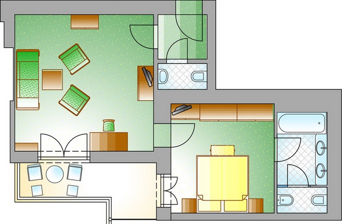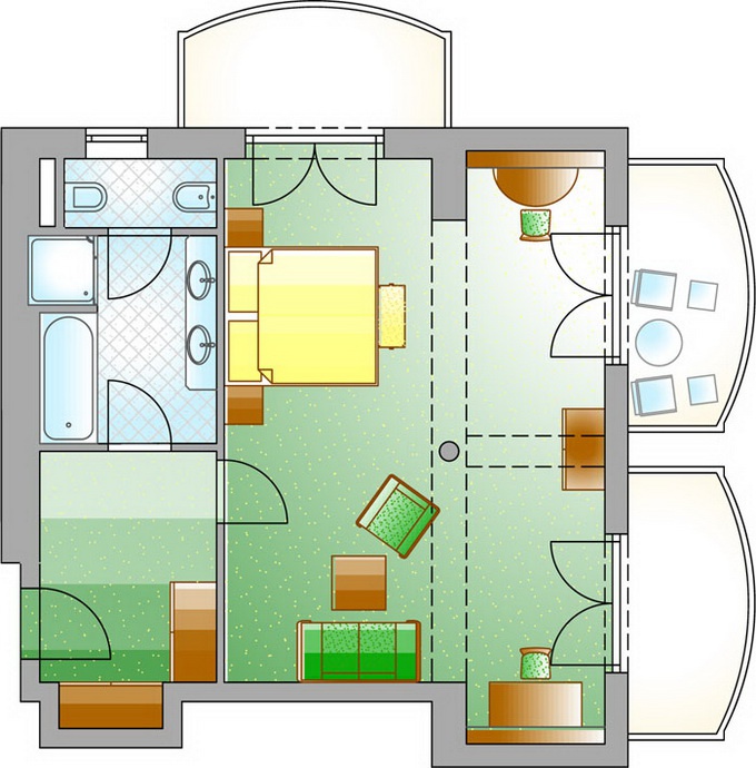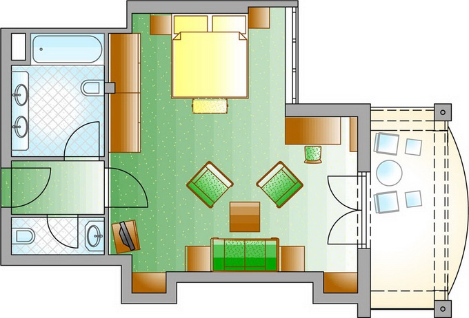 Double room De Luxe, CAT F: 34-40 м2, окна на восток или запад. В номере спальня c двуспальной или отдельными кроватями, гостиная зона, рабочее место, ванная комната, балкон.