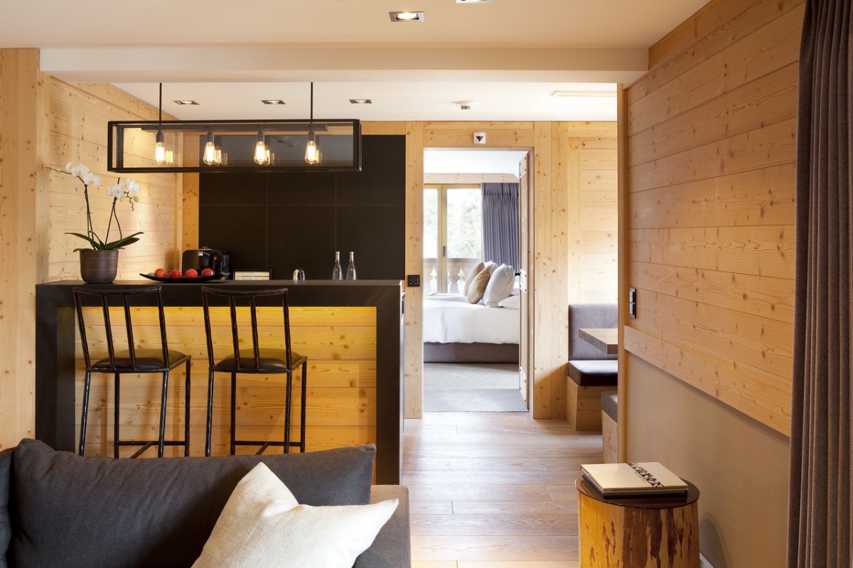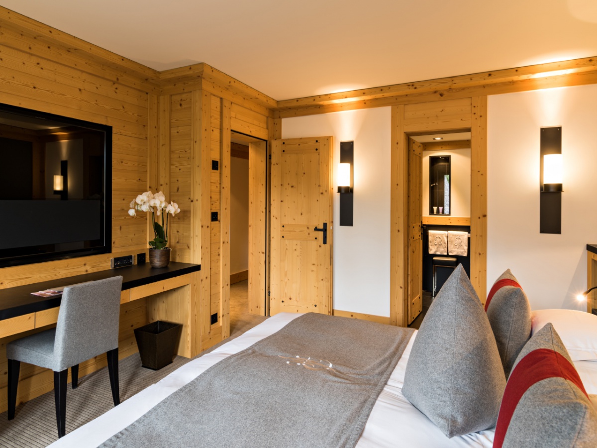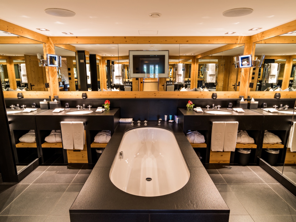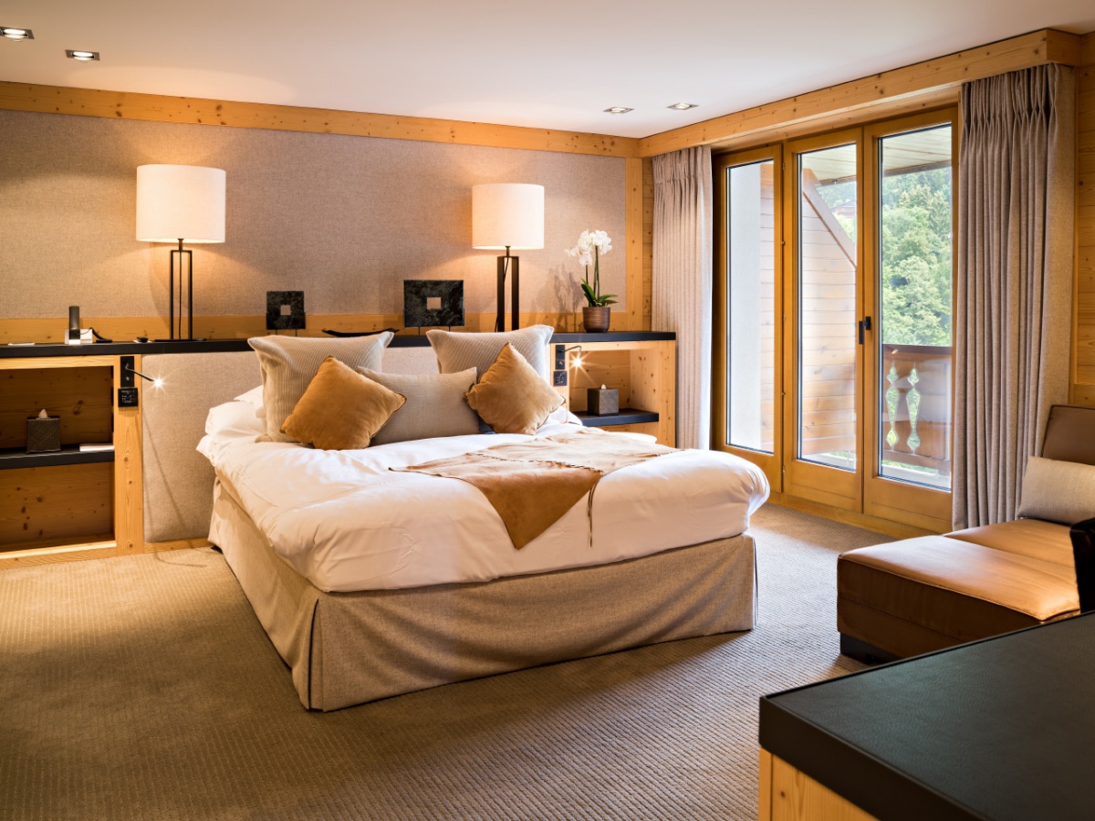 My Gstaad Chalet: 400 м2. Роскошный номер, расположенный на двух верхних этажах отеля, состоит из 4 спален, гостиной с камином, столовой, кухни, ванных комнат, персонального СПА с сауной, парной, джакузи и массажной зоной, балкона с видом на горы. Гостям номера предоставляются услуги персонального дворецкого.