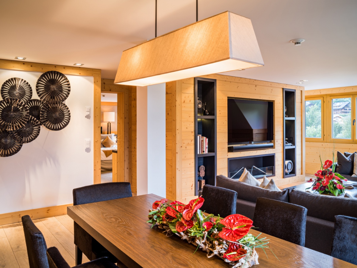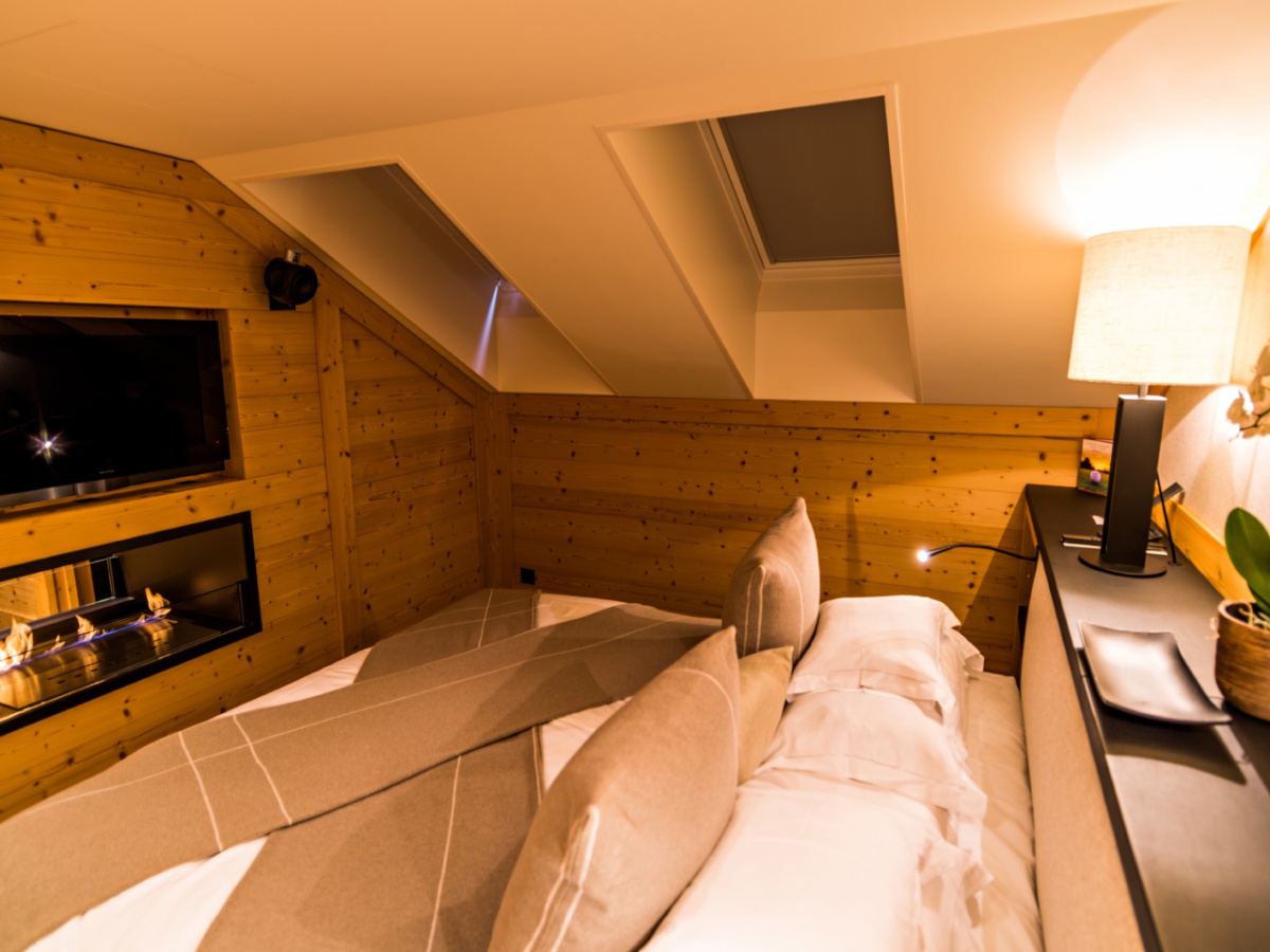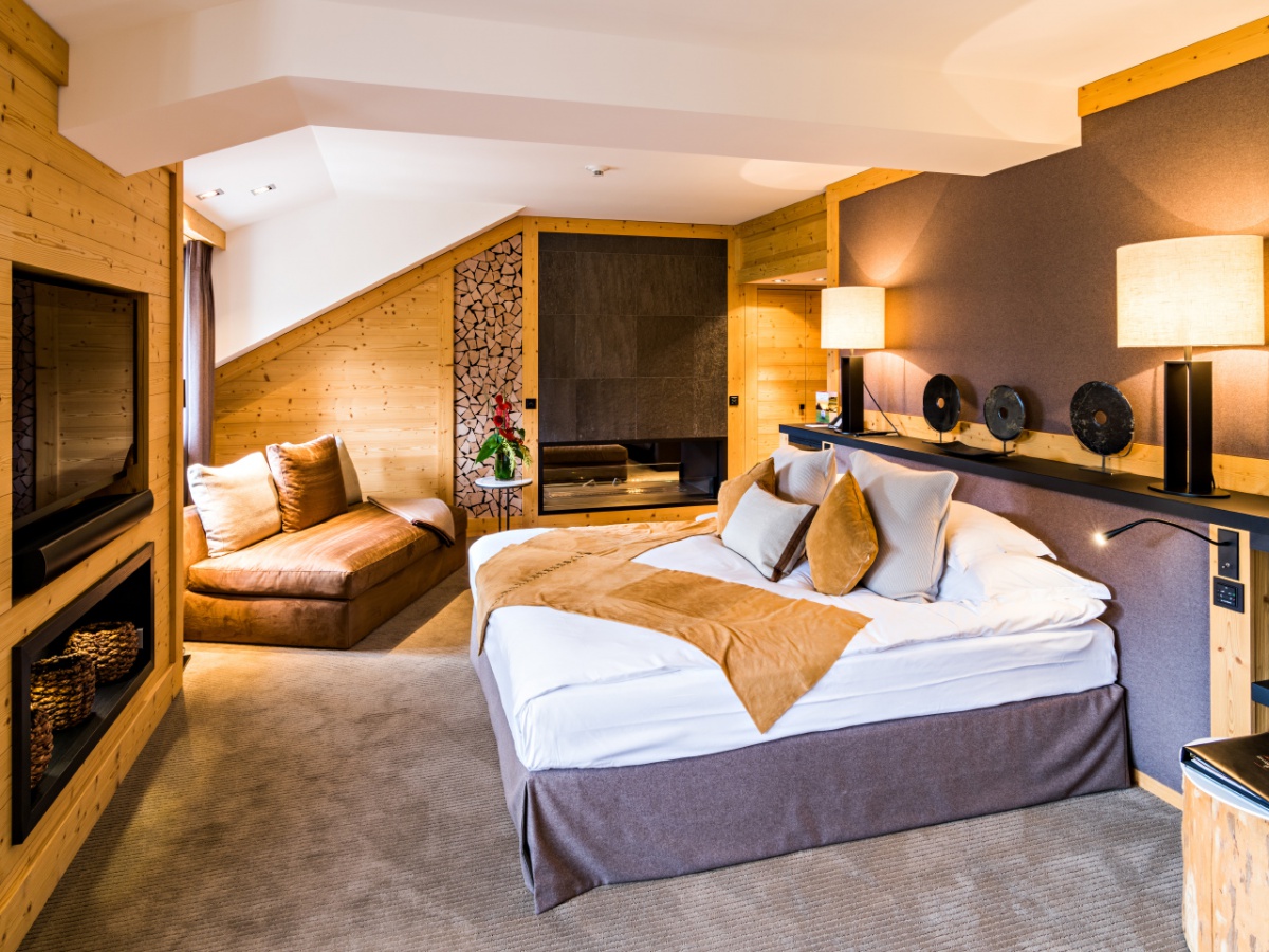 Suite Indulgence: 120 м2. Дуплекс, расположен на двух верхних этажах отеля, состоит из 2 спален, гардеробной, гостиной, столовой, ванной комнаты, балкона с видом на горы и деревню.