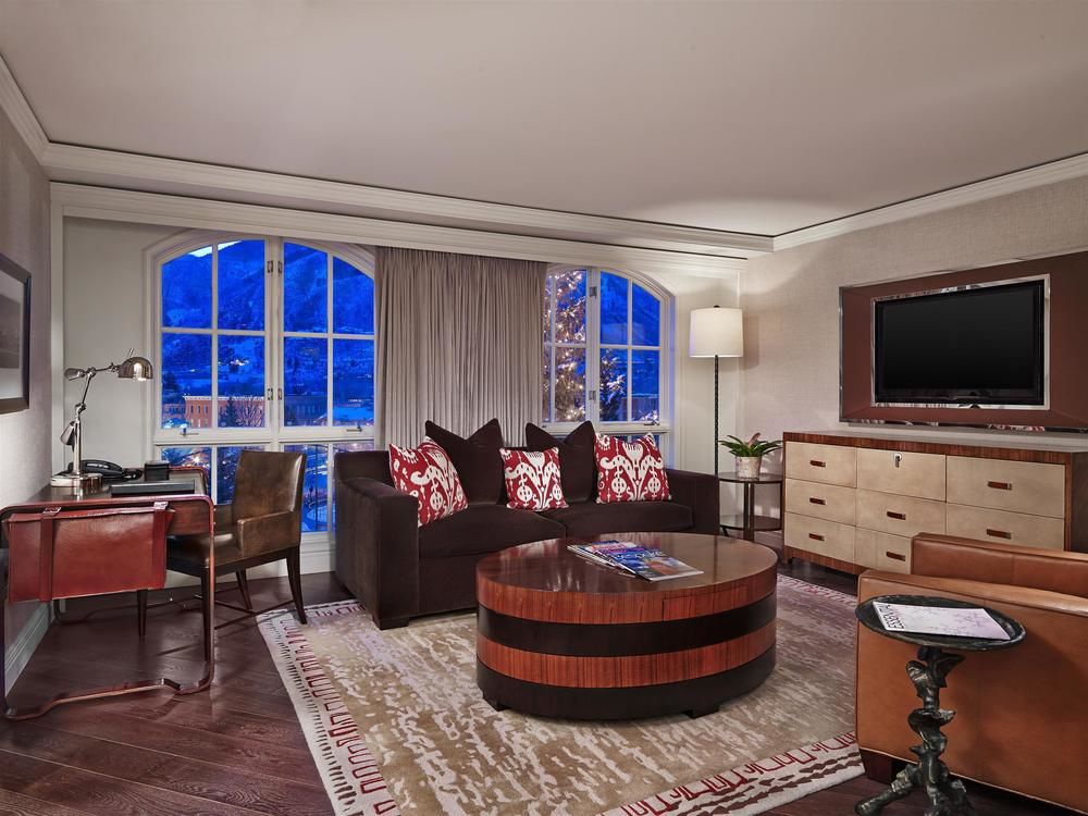 One Bedroom Suite: 76 м2. Состоит из спальни с кроватью king-size, гостиной с камином и раскладным диваном со спальным местом queen-size, ванной комнаты с ванной, душем и двумя раковинами. Вид на горы, внутренний двор отеля или Аспен.