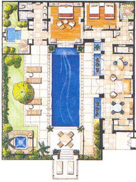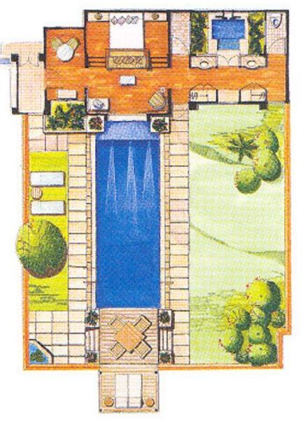 Two Bedroom Pool Villa: (350 кв.м) — состоит из гостиной с обеденной зоной, 2 спален с ванными комнатами (одна – с двумя отдельными кроватями), гардеробных, кухни, террасы с садом, зоной отдыха, джакузи и бассейном (3,5м х 9м).