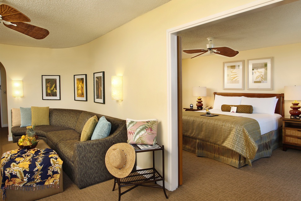 Kilohana Signature Suite: 102 м2. Фешенебельный номер, состоит из спальни с кроватью king-size, гостиной с диваном queen-size, обеденной зоной и мини-кухней, ванной комнаты, просторной террасы с потрясающим панорамным видом на океан. В номере имеются бинокли.
