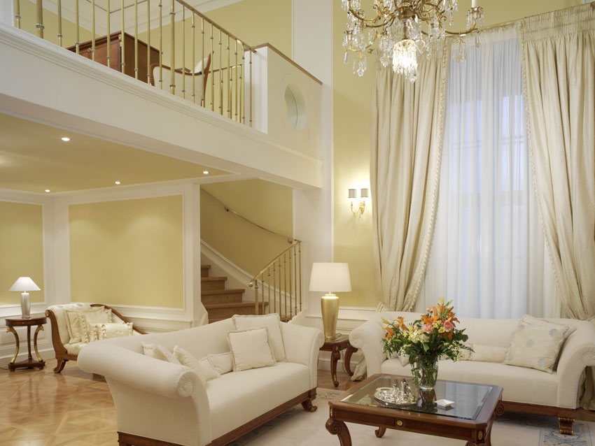 Marie Amelie Suite (104) : 89 м2. Посвящен французской принцессе Амрии-Амелии, выполнен в бежевых тонах, расположен рядом с церемониальными залами, в бельэтаже, выходит на сады. Включает: на первом этаже – холл, гостиную, кухню, гостевую туалетную комнату, на втором этаже – спальню, ванную комнату с джакузи и душевой кабиной.