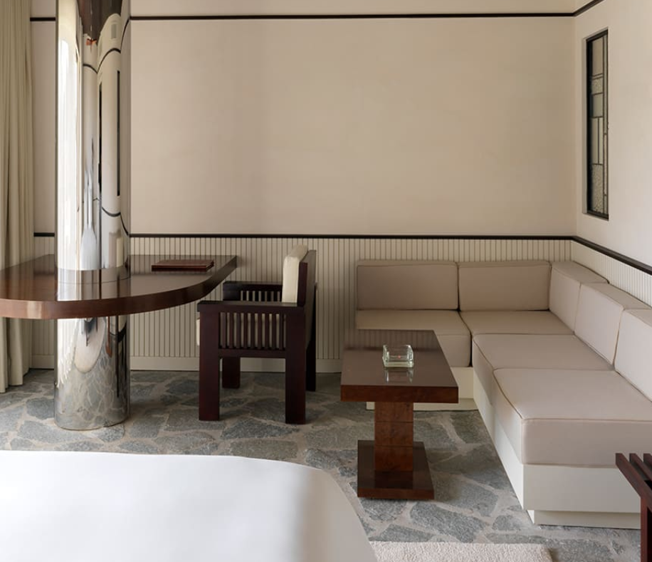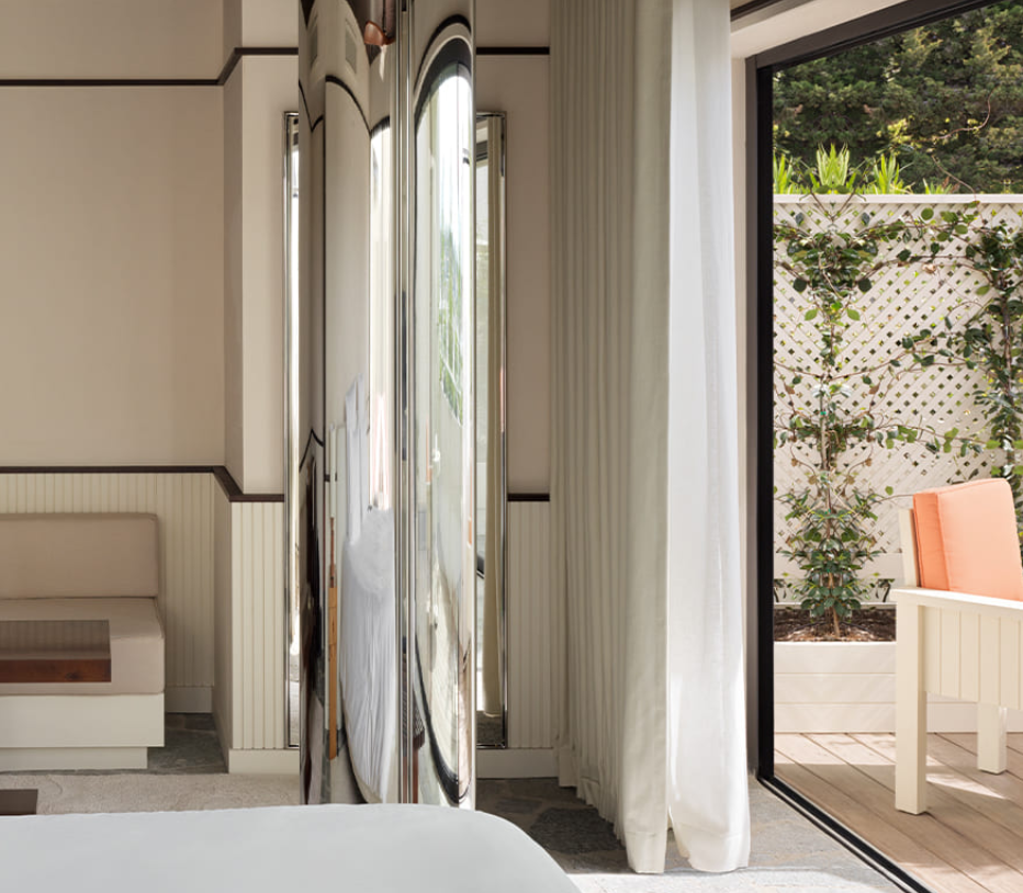 Это спокойный и минималистский номер площадью 30 м². Из него открывается прямой вид на сад или есть собственная терраса для тех, кто находится на верхнем этаже. В небольшой гостиной есть письменный стол, если вы хотите рисовать, читать книгу или работать удаленно. В ванных комнатах естественный свет смешивается с розовым мрамором через геометрические витражи. В большинстве номеров есть ванна.