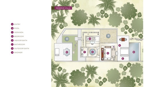 Reserve Pool Villa: 106 кв.м. Расположена среди тропического сада, включает спальню с кроватью king-size и гостиной зоной, гардеробные, открытую и крытые ванные комнаты, меблированную террасу, собственный бассейн, частный сад. Размещение – 2 человека.