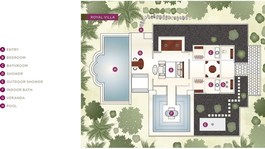 Royal Beach Villa: 120 кв.м. Выходит на океан, включает спальню с кроватью king-size с гостиной зоной, гардеробные, открытую и крытые ванные комнаты, меблированную веранду, просторный бассейн с гидромассажной зоной, тропический душ на открытом воздухе, большой сад. Размещение – 2 человека.