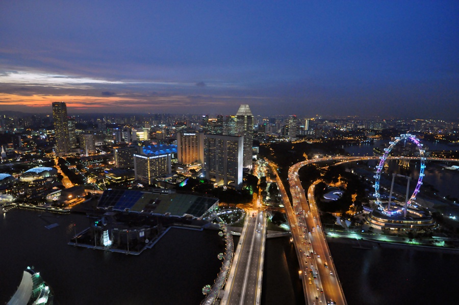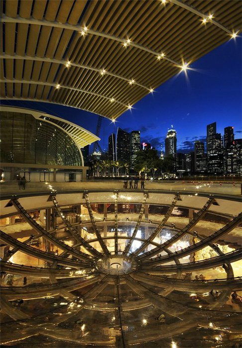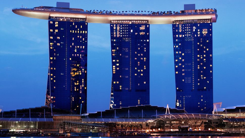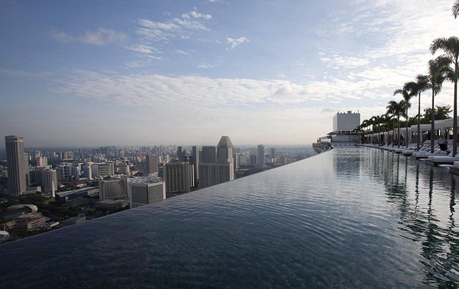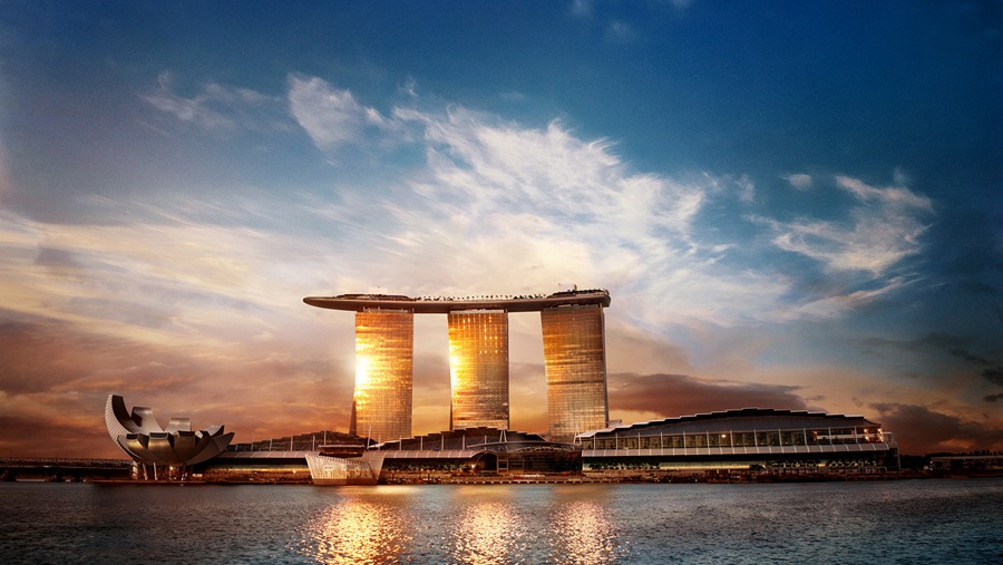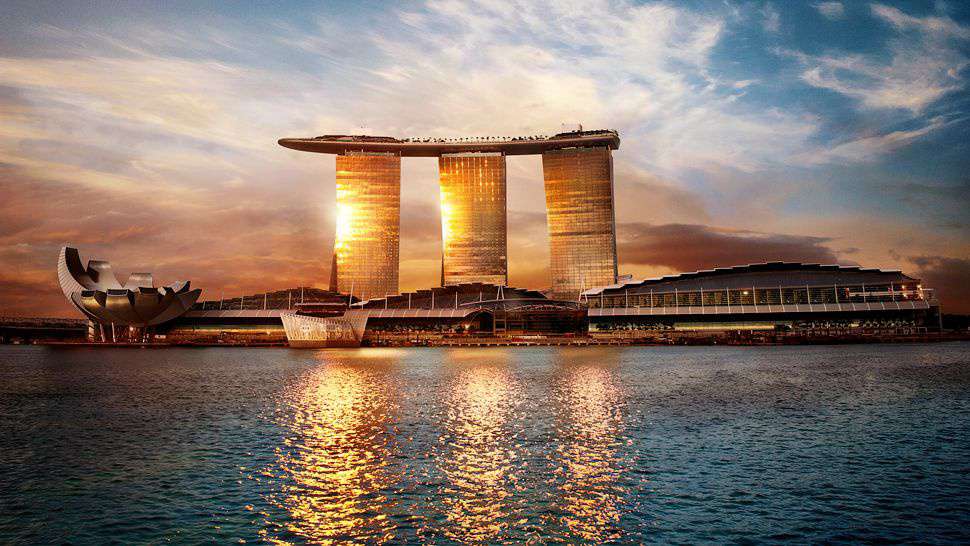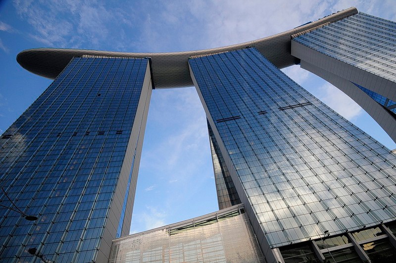В центре Сингапура, над сверкающей морской гладью возвышается Marina Bay Sands Сингапур — грандиозное сооружение из трех 55-этажных небоскребов, увенчанных гигантским океанским лайнером площадью 12400 м2 с фантастическим парком Sands SkyPark. Это архитектурное футуристическое чудо, спроектированное известным архитектором Моше Сафди и открытое в 2010 году, впечатляет невиданным размахом во всех отношениях. Здесь есть всё для отдыха, развлечений и бизнеса. Фешенебельный отель с более, чем 2500 роскошными номерами и сьютами, из панорамных окон которых открываются красивейшие ландшафты Сингапура и зеркальной морской глади. Более 60 ресторанов и баров, где, под руководством известных шеф-поваров из разных стран, готовятся изысканные блюда всех кухонь мира. Уникальный, словно сливающийся с небом огромный 150-метровый бассейн на высоте 200 м, прекрасный СПА центр и детский клуб для разных возрастов. Шикарное казино мирового класса, два театра, галерея с 300 бутиками модных брендов, великолепный музей в форме лотоса, галерея современного искусства, живописные сады, конгресс-центр, вмещающий до 45000 гостей, обширные выставочные площади, и даже водный канал, по которому можно прокатиться на старинной китайской лодке сампана.