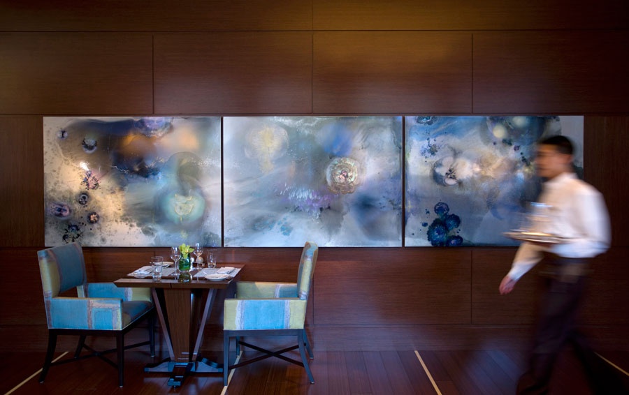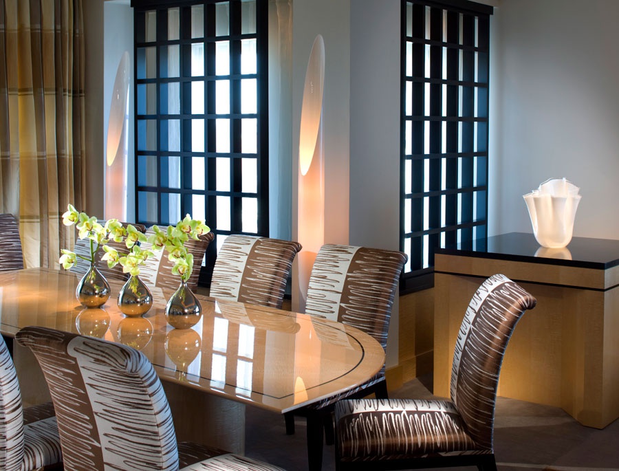 Dynasty Suite: 244 м2. Роскошный номер, украшенный произведениями современного искусства, состоит из гостиной с камином и обеденной зоной на 8 человек, кабинета, спальни с кроватью king-size, ванной комнаты со СПА ванной, отдельной душевой кабиной и гардеробной, гостевой ванной комнаты. Может соединяться с Mandarin Room и Mandarin Premier Room.
