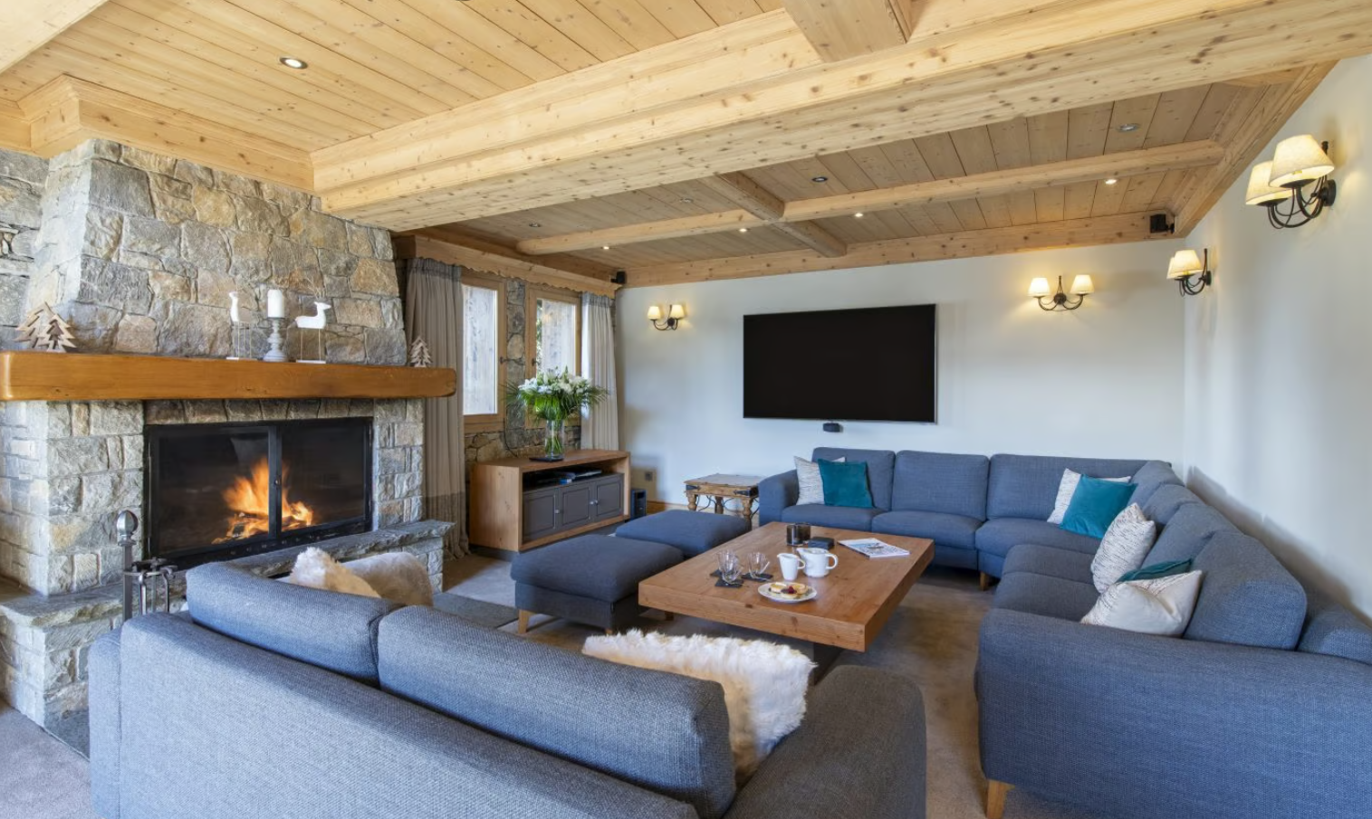 Поднявшись на второй этаж, вы увидите уютную и просторную гостиную. Это роскошное пространство имеет великолепный дровяной камин, окруженный плюшевыми диванами-раковинами, и телевизор. Рядом вас ждет уютная зона отдыха.