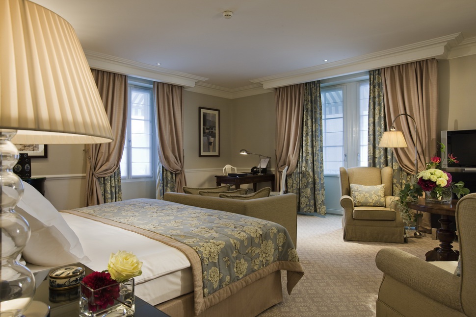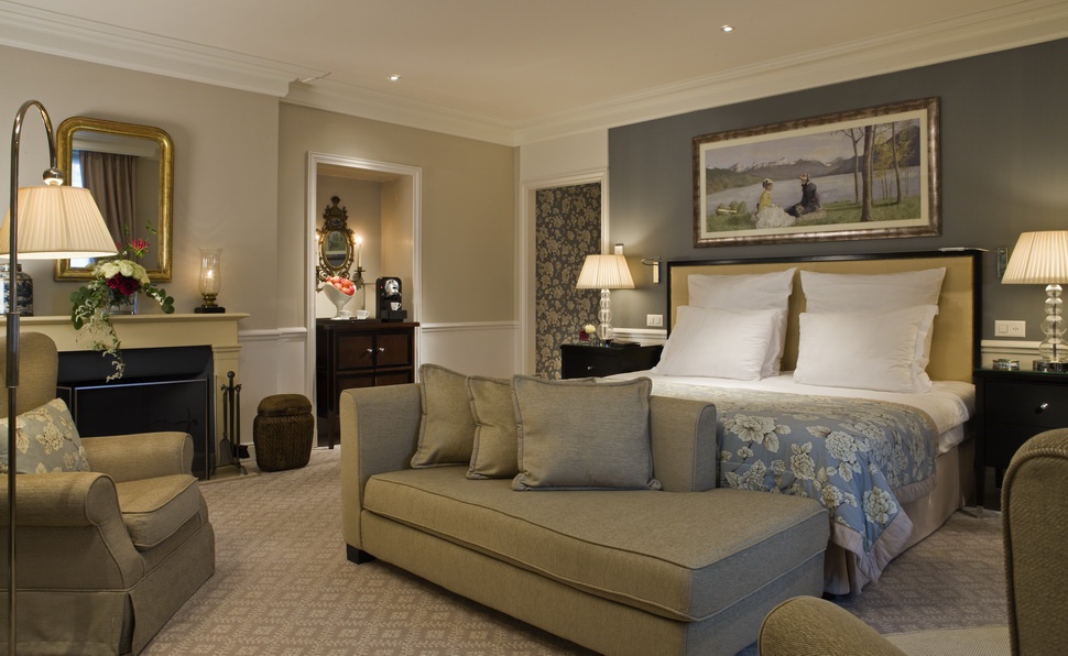 Leman suite (110 кв. м): балкон, гостиная с камином, столовая, мини-кухня, спальня с кроватью king-size, ванная комната с душем. Расположен на третьем этаже. Вид на озеро, горы и сад. Дополнительно: CD-плеер, факс, телевизор Bang&Olufsen. Дополнительная кровать предоставляется по запросу.