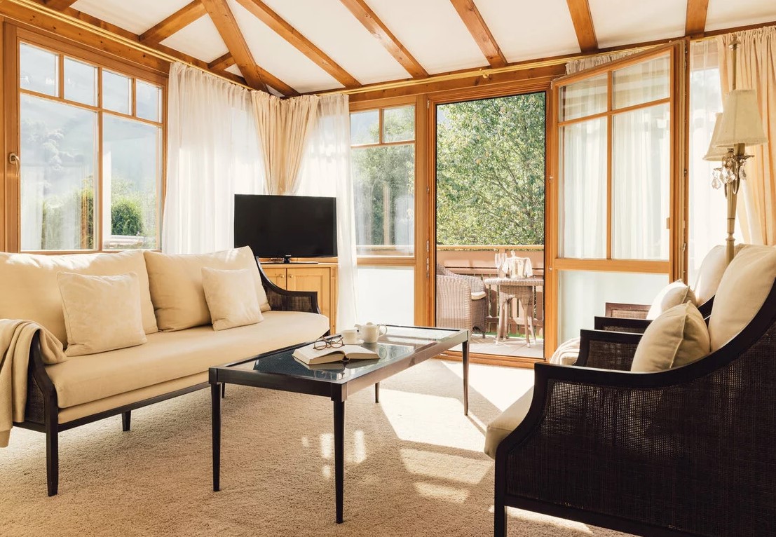Люкс «Жардин» — эксклюзивный трехкомнатный номер площадью 75 м². Все внутри и вокруг него соответствует естественному расслаблению и восстановлению. Натуральное старинное дерево, кремовые ткани, уютная изразцовая печь, солнечный зимний сад и садовая терраса, а также отдельная комната предлагают вам особенно комфортное пребывание. Suite Jardin расположен на первом этаже и включает в себя прекрасный частный сад с видом на парк и панораму гор Арнталер. Ванна: Душ, джакузи, отдельный туалет, биде.