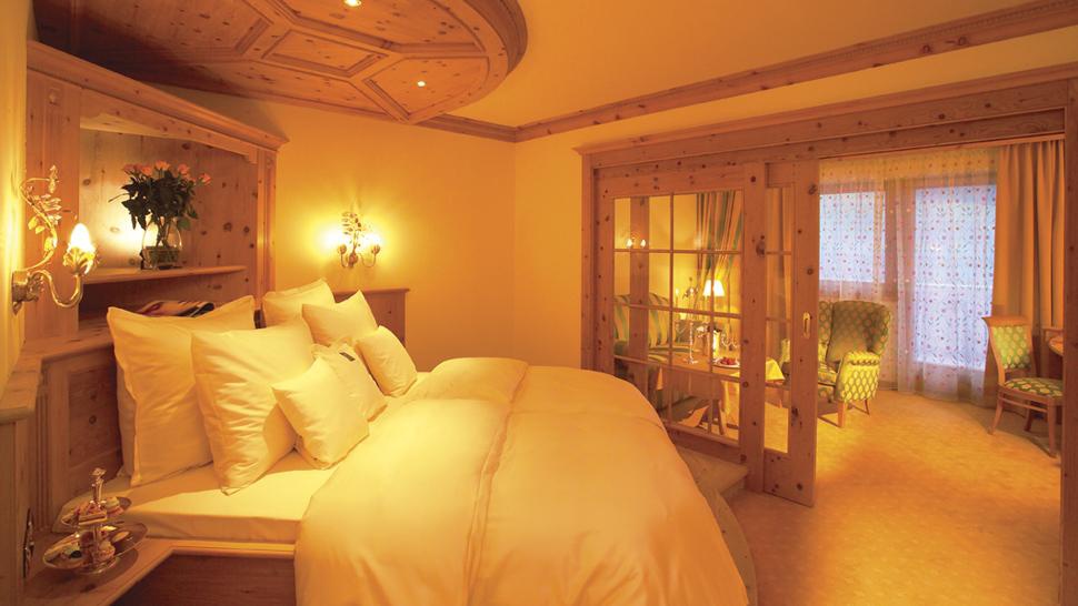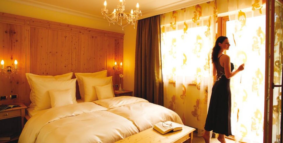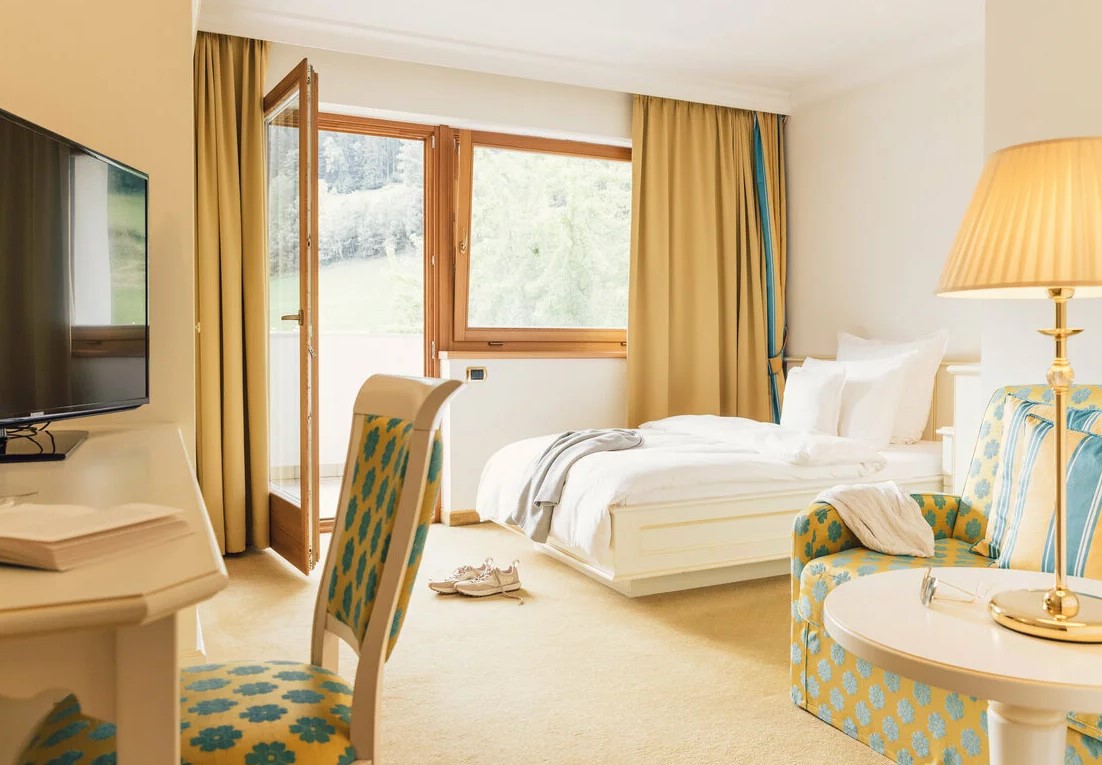 Отель располагает номерами различных категорий, включая Room и Suite. Номера выполнены в элегантном современном стиле, дополненном альпийскими традициями, отделаны натуральными деревом и изысканно декорированы, с балконов открывается великолепный панорамный вид на горы и восхитительный парк отеля.