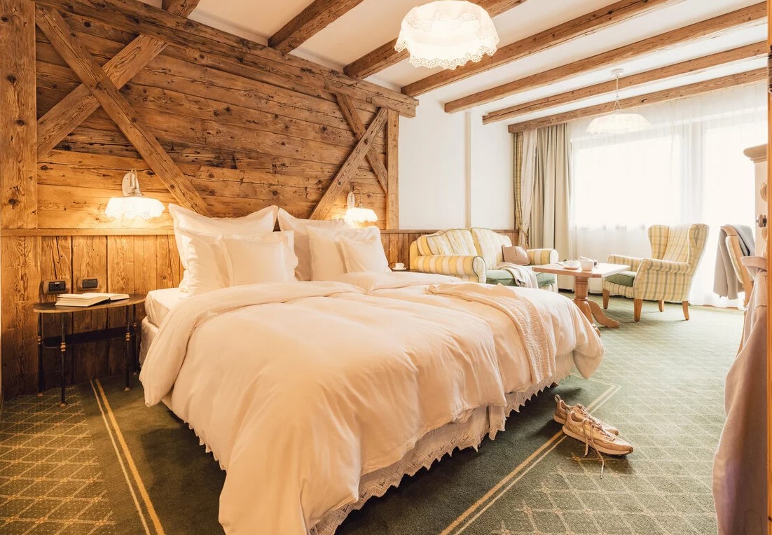 Двухместные номера категории Country Living в деревенском стиле площадью 35 кв. м. Зеленые и розовые оттенки, оригинальное дерево из старых конюшен и уютная изразцовая печь придают этим номерам домашнюю атмосферу. Все двухместные номера категории Country Living располагают балконом с прекрасным панорамным видом на Альпы и расположены на втором этаже. Ванная комната: паровой душ, туалет, биде.