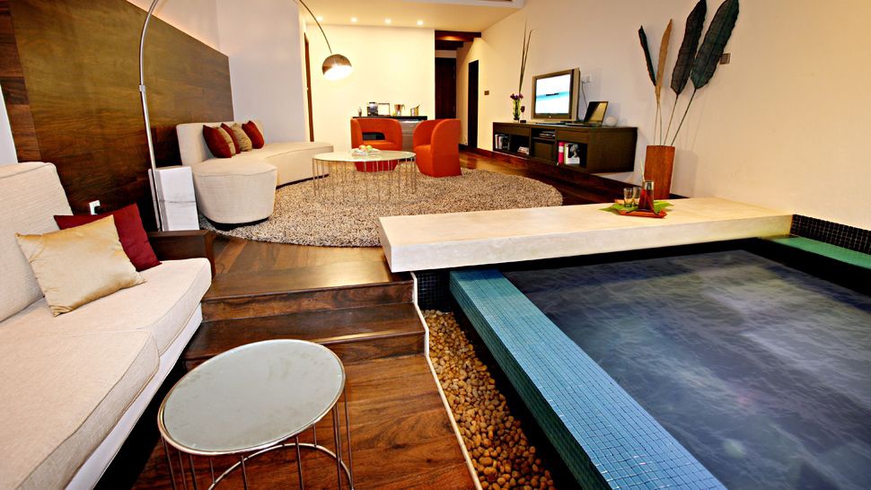 Ocean Loft: двухуровневый номер, на первом этаже – гостиная с крытым бассейном, терраса, на втором – спальня с зоной отдыха, ванная комната.