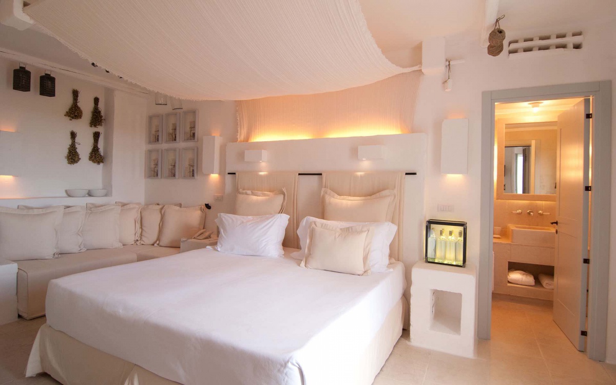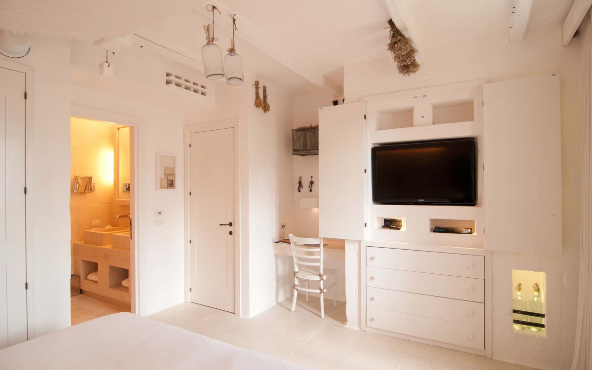 125 м2, роскошный номер, состоит из спальни с кроватью king-size с гардеробной, ванной комнаты с большой ванной и душем на две персоны, зоны отдыха с декоративным камином, гостиной с большим диваном, 2 террас с видом на оливковую рощу и море, сада с бассейном и душем на открытом воздухе. Возможно соединение с LaCorte Bella. Максимальное размещение — 2 человека.