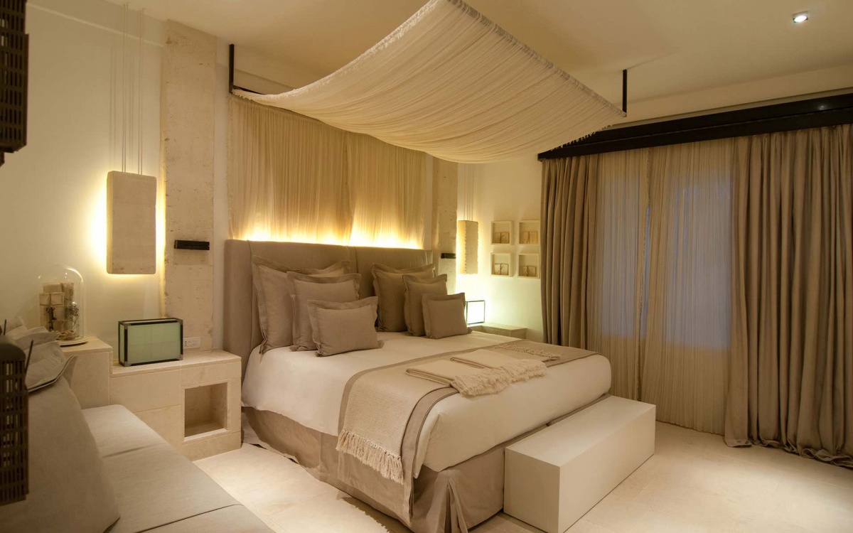 55 м2, просторный номер, состоит из спальни с кроватью king-size под пологом, гостиной зоны со столиком для ланча и диваном, ванной комнаты, балкона и террасы на крыше с шезлонгами, столиком и стульями. Максимальное размещение — 2 человека.