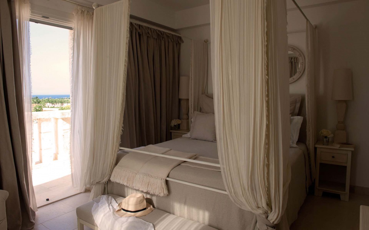В отеле 194 номера различных категорий, включая 63 номера в центральном здании La Corte (21 Deluxe Rooms, 34 Superior Rooms, 7 Grand Suites и Suite Egnathia), 93 коттеджа в стилизованной апулийской деревне Borgo и 28 вилл. Интерьеры номеров воссоздают уютный и изысканный стиль в традициях Апулии: белоснежные оттенки, изящная мебель, стены из местного камня и изделия местных масетров. С балконов открываются изумительные виды на изумрудную зелень арабских садов, живописные холмы, бассейны и лазурное море.