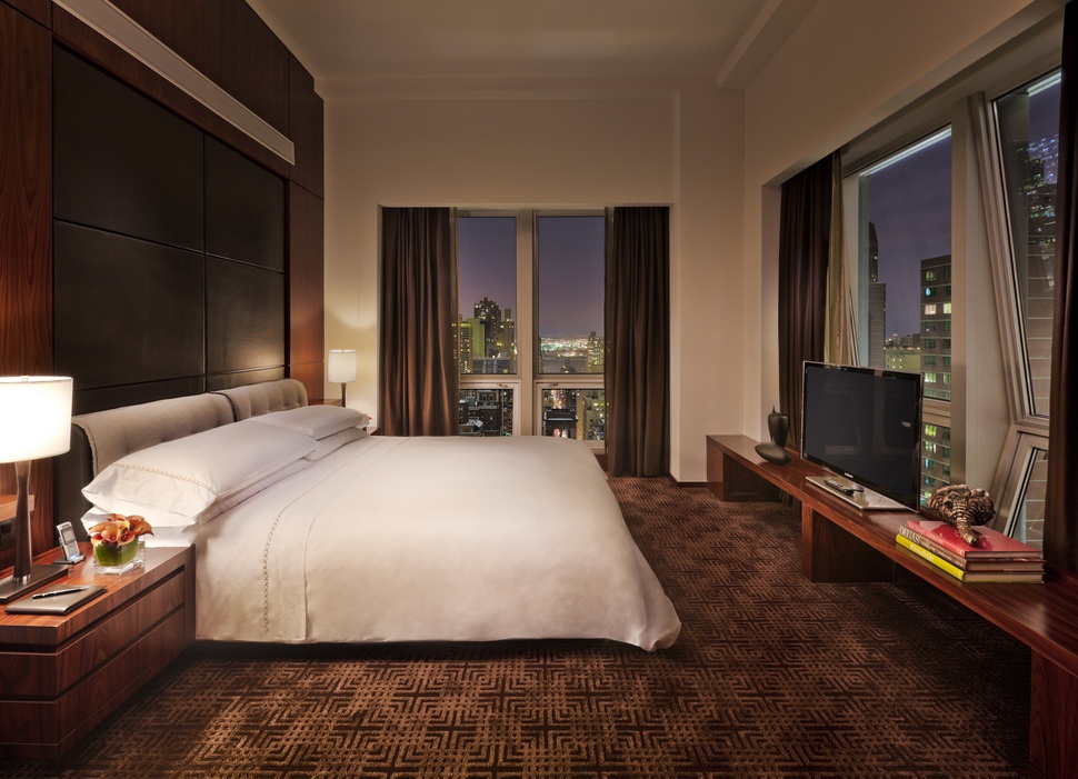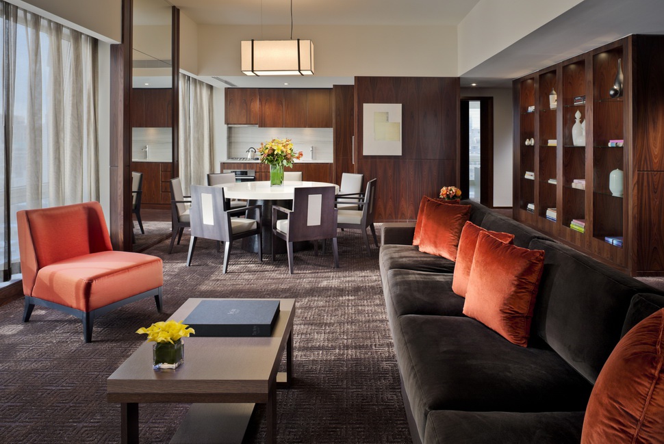 Langham Suite: – 97 м2. Современный роскошный номер с видом на Fifth Avenue или город на фоне неба находится на 18 – 27 этаже отеля. Состоит из спальни с кроватью king-size, гостиной, кухни, оборудованной техникой Miele и ванной комнаты, отделанной мрамором, с душем и ванной. Возможно размещение двух дополнительных кроватей.