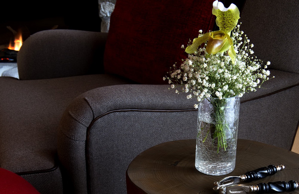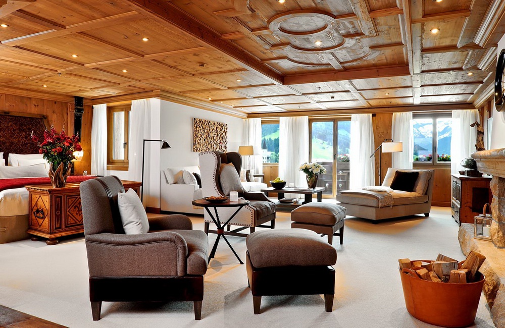 Junior Suite: состоит из спальни, гостиной зоны с выложенным из камня камином и обеденной зоной, ванной комнаты с ванной и отдельным душем, балкона или террасы с видом на окрестности Гштаада.