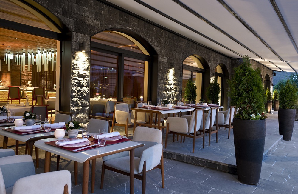 Panorama Suite: 400 кв.м. Роскошный двухуровневый номер, выходит на северную и южную стороны, включает: 3 спальни с ванными комнатами (одна спальня с камином, гардеробной и большой ванной комнатой с ванной и душевой кабиной), просторную гостиную с обеденной зоной, кухню, фитнес-зону с тренажерами, джакузи и массажным столом, с террас и веранды номера открывается захватывающий вид, выходит на северную и южную сторону.