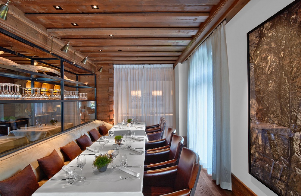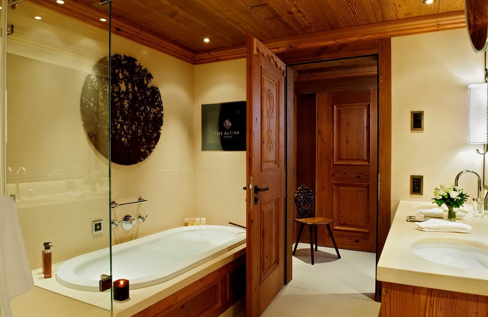 Grand Luxe Suite: состоит из спальни, гостиной с выложенным из камня камином, дополнительной гостиной зоны и обеденной зоны, кабинета, ванной комнаты с ванной и отдельным душем, гостевой туалетной комнаты, гардеробной, террасы, выходящей на южную сторону, ледник Дьяблере и Гштаад.