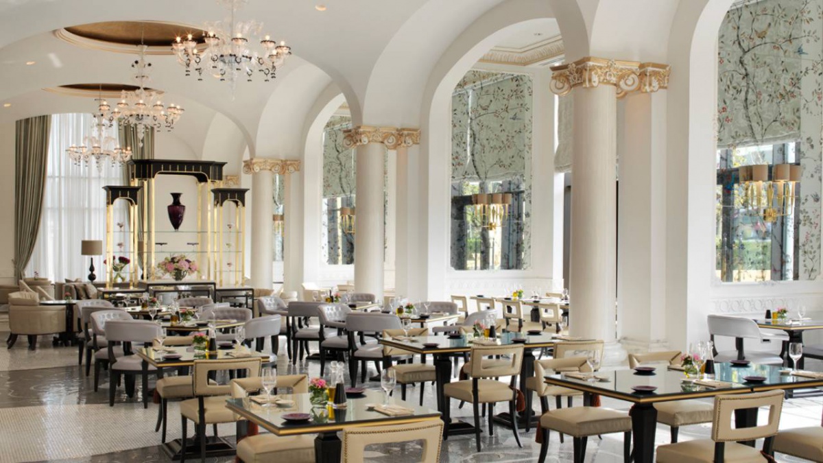 Высокие потолки с лепниной, статные колонны и большие витринные окна в пол с захватывающим видом на летнюю террасу заведения и набережную... Днем пространство ресторанов заполняется естественным мягким светом, который проникает через арочные окна, отражаясь от белых массивных колонн.