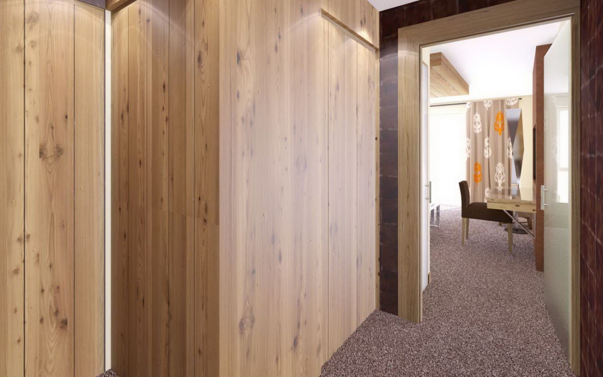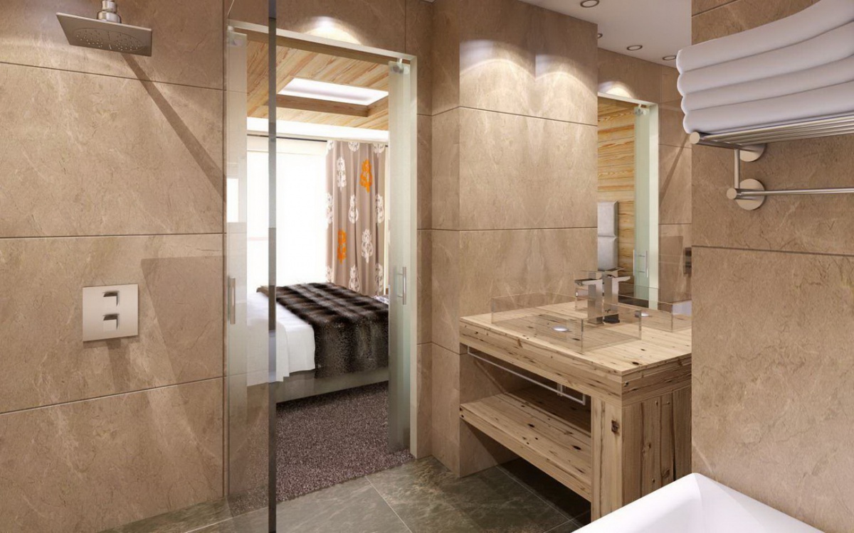 Семейный номер площадью 48 кв. м, состоящий из 2 двуспальных кроватей (или 4 односпальных кроватей по запросу только при бронировании), ванной комнаты с ванной и еще одной ванной комнаты с душем, только один туалет в номере. Просторный собственный балкон с панорамным видом на склоны; южная экспозиция.