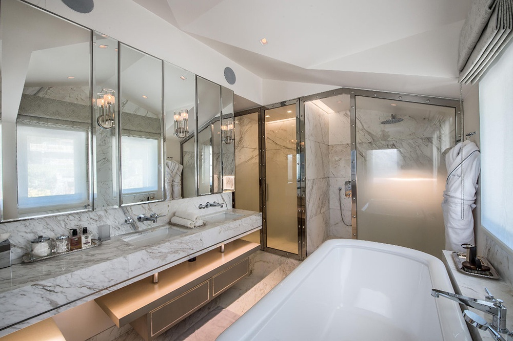 • Главная спальня: ванная комната с двумя раковинами, ванной, душем, туалетом и биде, камином, гардеробной, балконом и сейфом