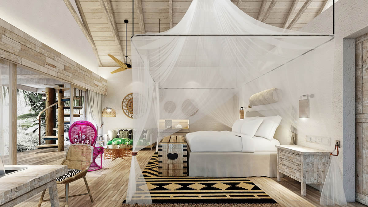 54-65 кв. м. Романтичное бунгало расположенное среди огромных пальм рядом с основными инфраструктурными объектами курорта и Коралловым пляже на северной стороне острова. Номер состоит из спальни с кроватью размера «king-size», софы и зоны отдыха, мраморной ванной комнаты с глубокой ванной, двойной раковиной, двойного тропического душа, террасы, душа на открытом воздухе, беседки и небольшого бассейна. Частичный вид на океан, прямой доступ к пляжу. Доступно бронирование детской кровати. Размещение: 2 взрослых или 1 ребенок.