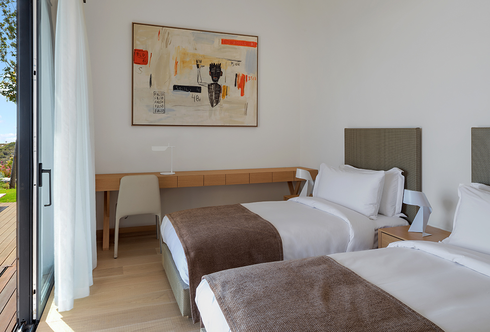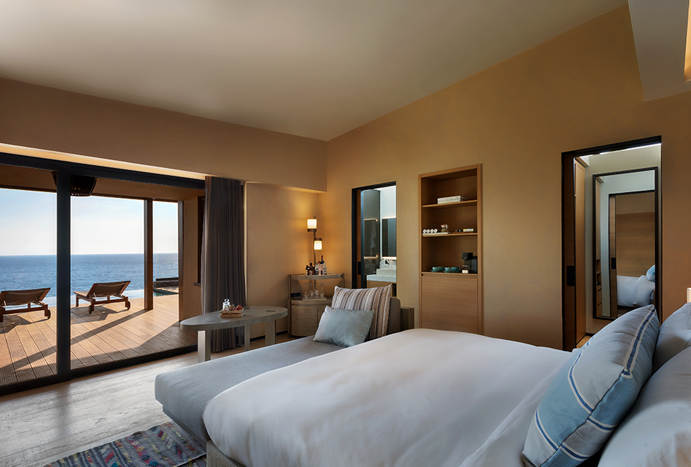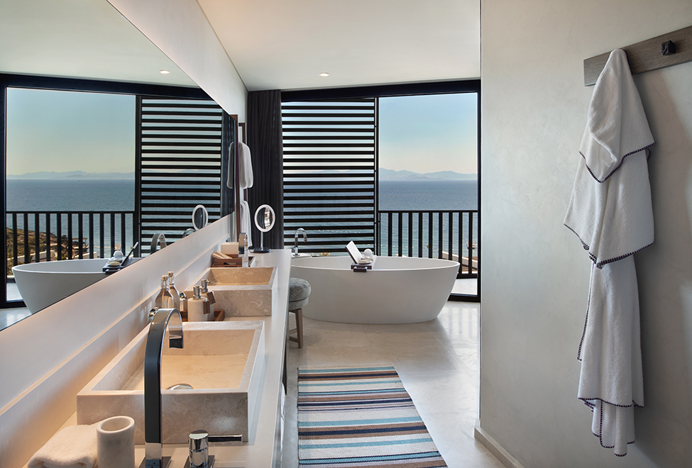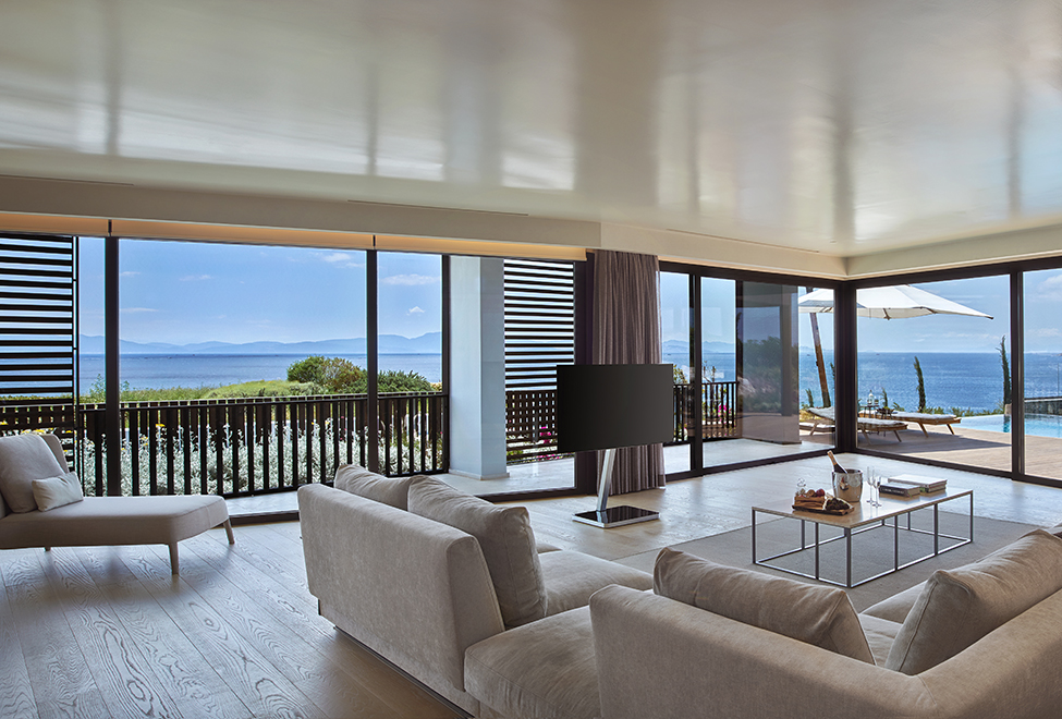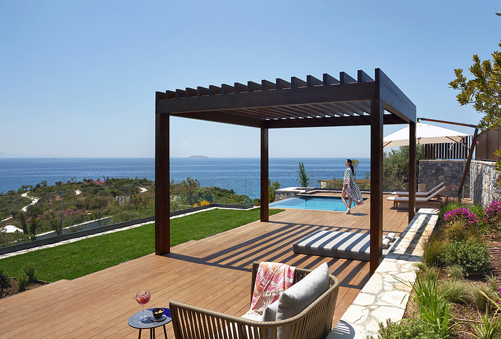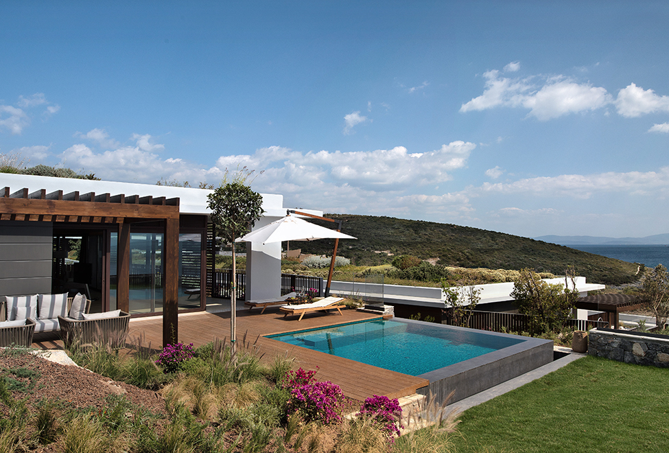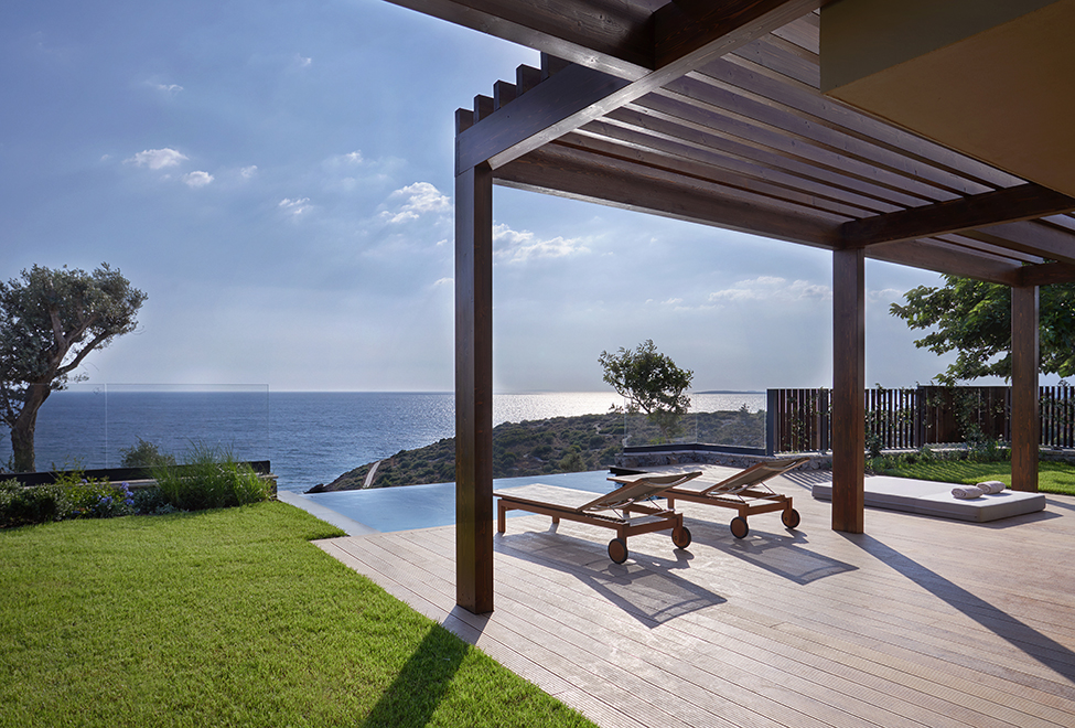 Уютная вилла может иметь площадь от 41 до 46 м2. Располагаются уединенные домики этой категории на холме вдали от главного здания. Современный и стильный дизайн выполнен в светлых теплых тонах с использованием качественной древесины. Гости смогут отдохнуть на собственной просторной террасе и насладиться живописными пейзажами Эгейского моря и тенистых садов отеля. Роскошная мраморная ванная комната оборудована двойной раковиной и душем.